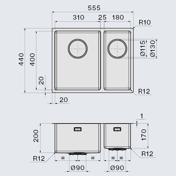 - Радиус внутренних углов 12 мм