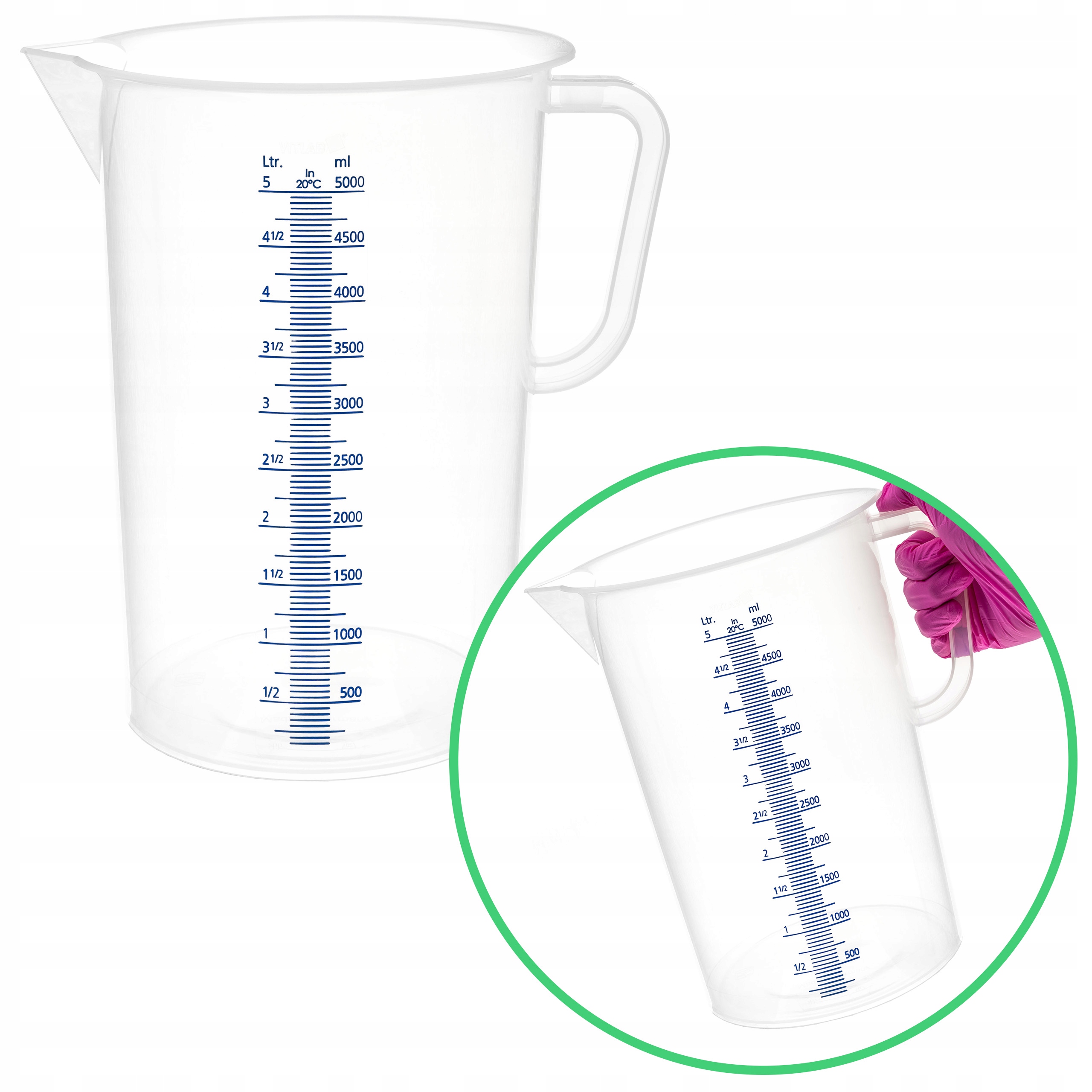 Пластиковый стакан с ушной полипропиленовой шкалой нажатой 5000 мл Vitlab ровно