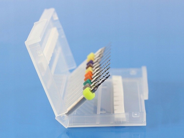 В наборе 10 штук с диаметром сверления от 0,3. до 1,2 мм упакованы в прозрачную коробку.