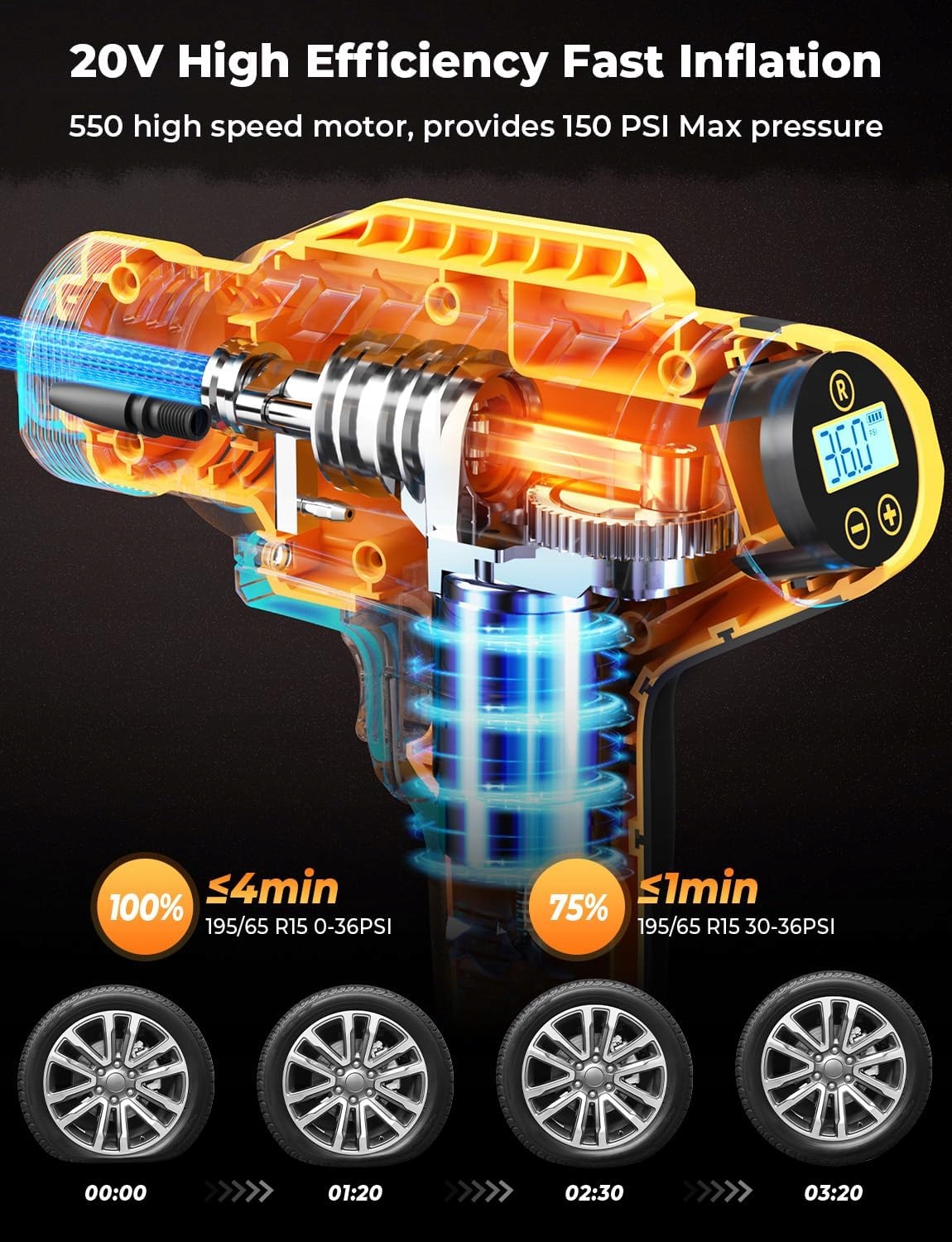 Быстрая перекачка: Этот портативный воздушный компрессор, питаемый батареей, может быстро накачать, размер 195/65/R15 от 30 до 36 собак за 1 минуту, от 0 до 36 фунтов на квадратный дюйм может быть раздут в течение 3-4 минут. Этот насос шин может надуть 6 шин с размер 185/70 R14 сразу, а также мотоциклетные шины x 15 ПК; Велосипедные шины x 24 ПК; Баскетбольные шарики x 90 ПК