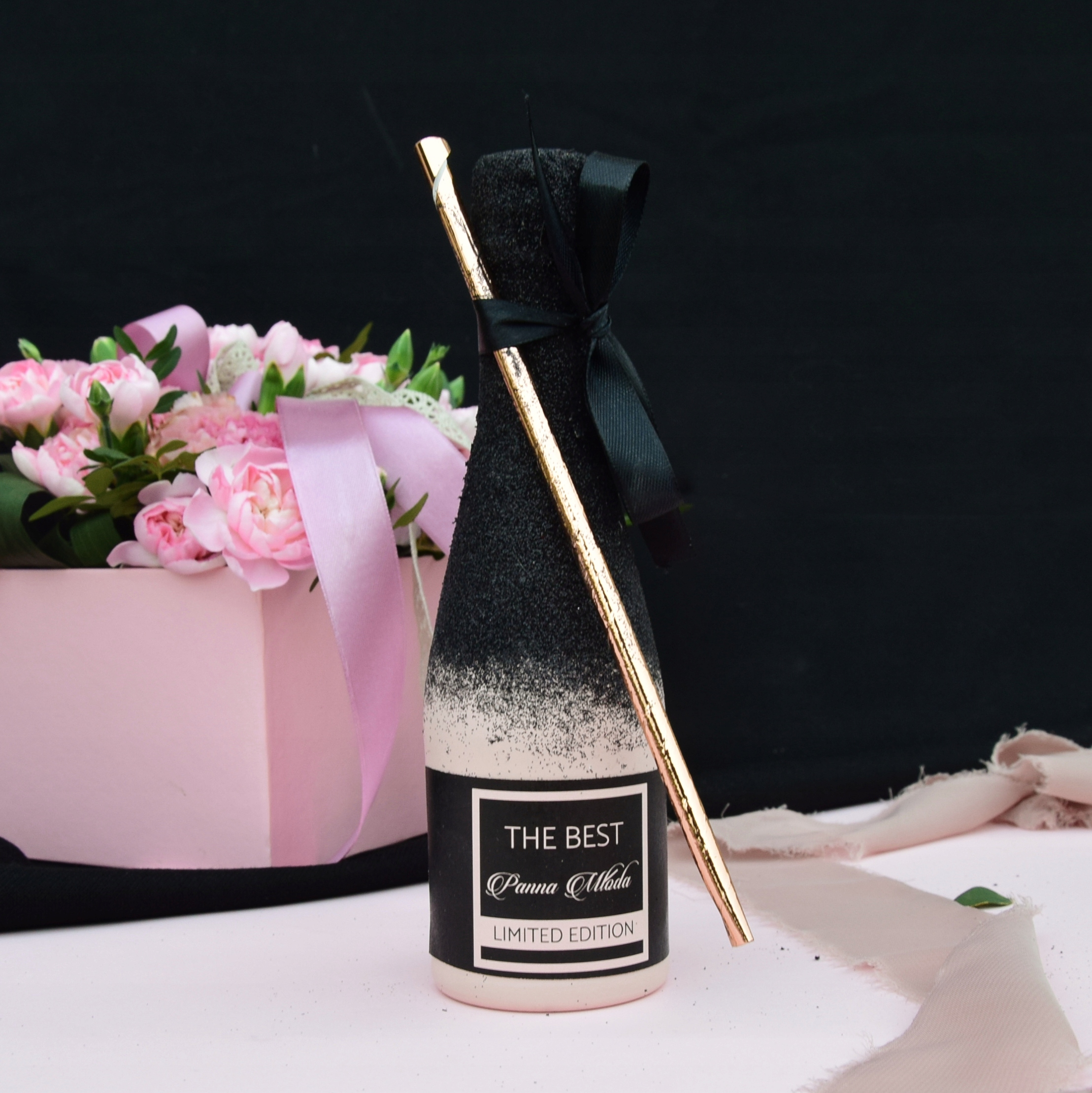 - цвет: пудровый розовый + черный блеск + наклейка в тон + лента