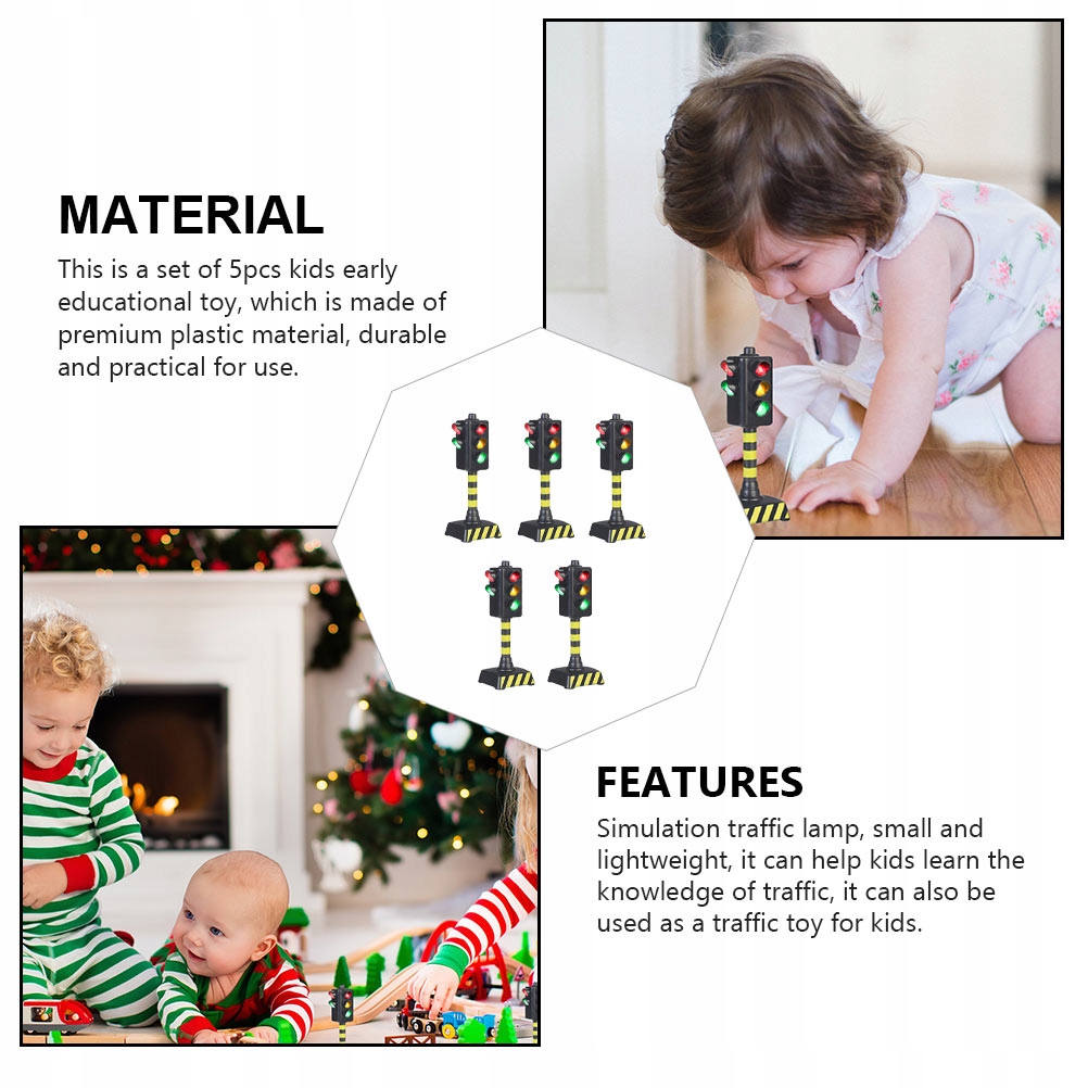 Это набор из 5 развивающих игрушек для детей, изготовленных из высококачественного пластика, прочного и практичного в использовании. Маленькая и легкая лампа-симулятор поможет детям изучить дорожное движение, а также может использоваться в качестве дорожной игрушки для детей.