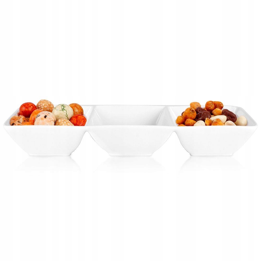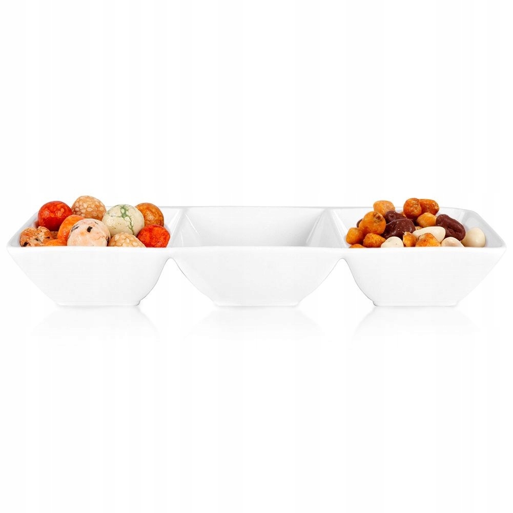 Длинная миска для закусок, разделенная на три миски меньшего размера. Чаша изготовлена из фарфора высочайшего качества, поэтому является отличной идеей для подарка. Чрезвычайно полезен не только в повседневном использовании, но и во время встреч. В нем можно подавать соленые закуски, сладости или соусы, не беспокоясь, что они перемешаются. Белый фарфор красиво смотрится на столе и является декоративным элементом, сочетающимся с остальной посудой. Изготовлено в соответствии с европейскими стандартами.