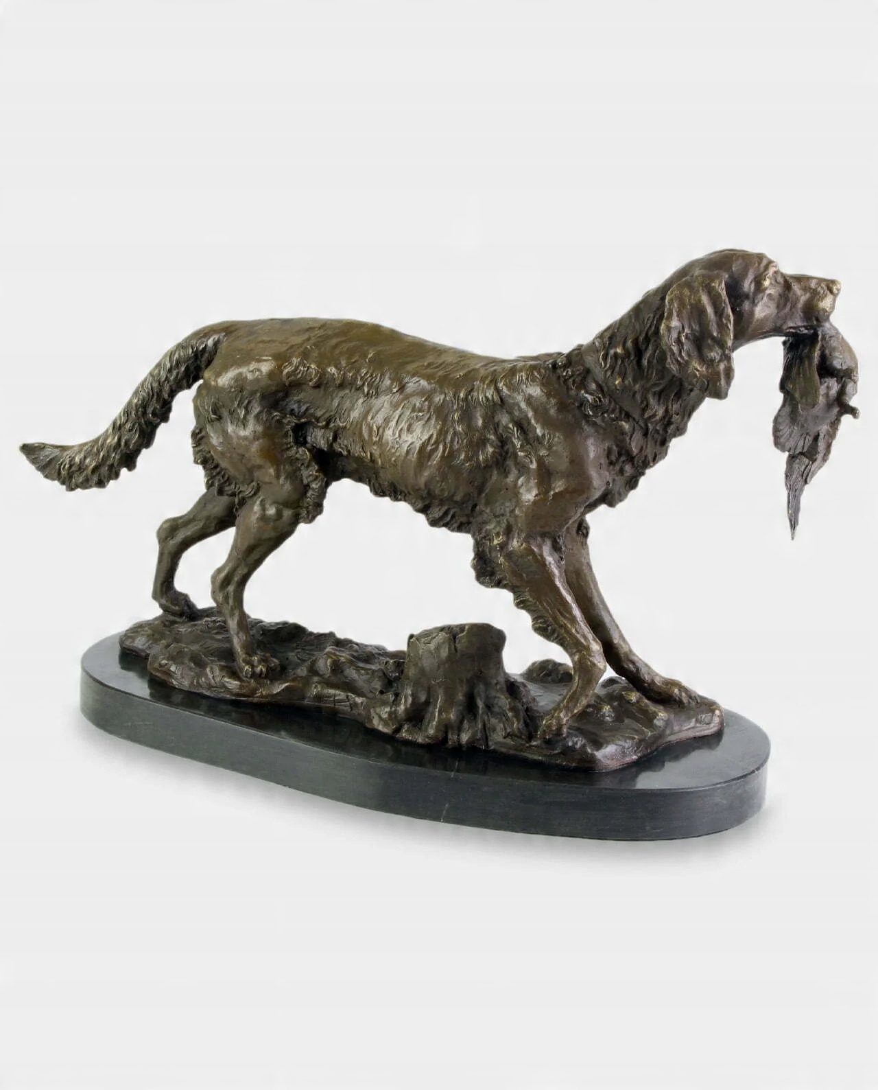 Бронзовая скульптура, изображающая охотничью собаку, несущую добытого фазана. Красивая, подписанная скульптура, выполненная из эксклюзивного материала очень точно, с вниманием к мельчайшим деталям. Установлен на черном мраморном основании. Фигурка производит большое эстетическое впечатление и имеет вневременной стиль. Подходит ко многим интерьерам.