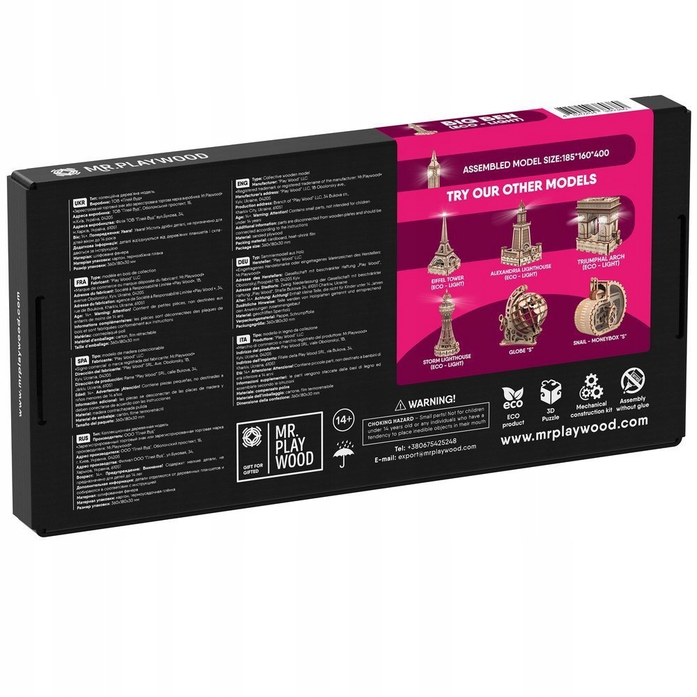 Клей не требуется для сборки этой модели! Все элементы были лазерно разрезаны. Все, что вам нужно сделать, это осторожно отделить части от кадра, , на которых они находятся. Название «Биг Бен» на самом деле относится к 13-тонному колоколу, висящему в башне Вестминстерского дворца. Спасибо деревянным 3D -моделям от MR. Playwood "Eco-Light", вы можете понять основные принципы механики и электромеханики. После складывания динамо, ребенок сможет выяснить, как двигатель игрушечного игрушка генератора превращает его мощность в экологически чистый источник энергии, который освещает небольшую лампу. Все необходимые детали включены в набор