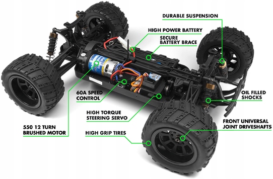 Модель оснащена двигателем 550 кистей, который позволяет вам достичь около 40 км/ч. Эта комбинация достаточно достаточно для модератора начинающих. Однако, если вам нравятся модификации и экстремальные переживания, вы можете увеличить скорость, используя батарею с повышенным напряжением - Lipo, однако, помните, что более длительное веселье в такой конфигурации может вызвать перегрев двигателя. Лучшее решение - обогатить вашу модель бесщеточным набором (двигатель + регулятор) и батареи Lipo, что приведет к резкому увеличению мощности автомобиля. Скорость 80 км/ч не будет проблемой для него