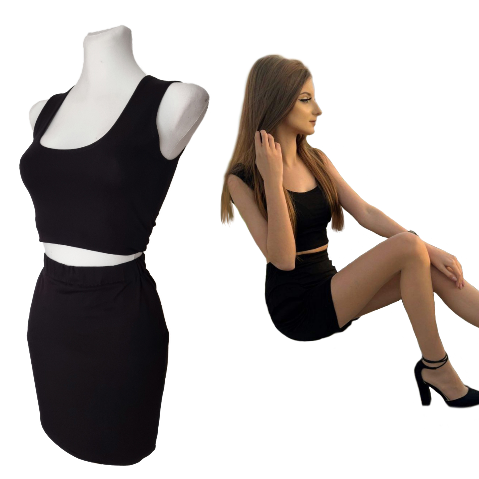 Мини-юбка-карандаш + короткий топ на бретелях.