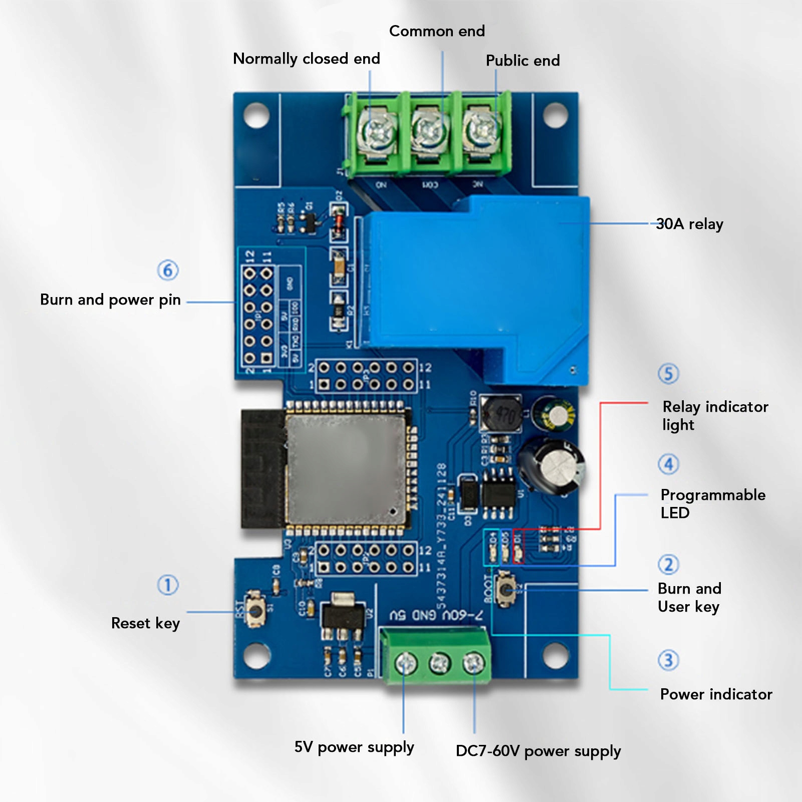 2. Power Supply: для ESP32 RELay 30A X1 Семейство 30A Семейство. Все порты ввода/вывода являются светодиодными, а источник питания DC7-60V/5V составляет