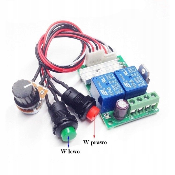 Рабочее напряжение модуля контроллера скорости двигателя постоянного тока от 6В до 24В. Управление осуществляется с помощью импульсной технологии ШИМ с низкими потерями мощности. Регулировка производится с помощью потенциометра, прикрепленного к тросу длиной примерно 20 см. Контроллер имеет переключатели для изменения направления вправо (красный) или влево (зеленый). Эти кнопки являются моностабильными, и двигатель работает только при нажатии одной или другой.