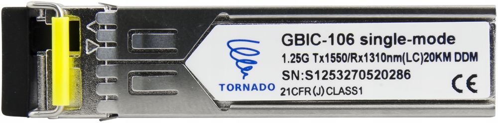 Вставка GBIC-106 Tornado представляет собой модуль, предназначенный для передачи по одномодовому оптоволокну (SM) на расстояние до 20 км.