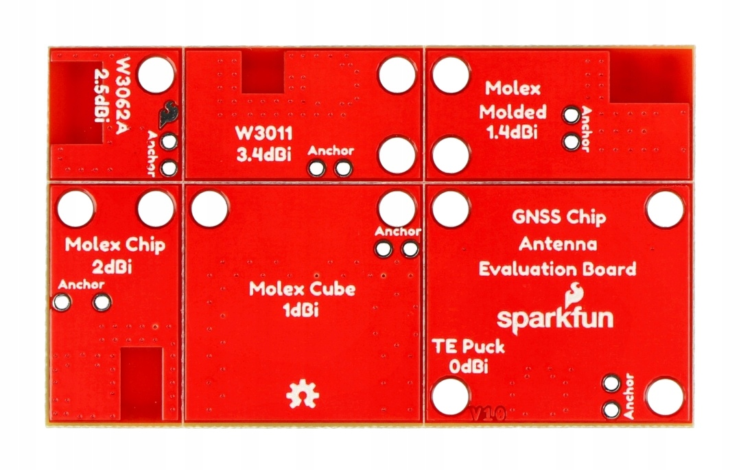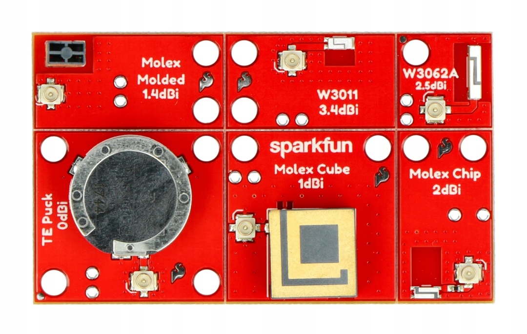 Модуль, содержащий 6 различных антенн GNSS с разъемом u.FL. На плате установлены такие антенны как: Molex Moled, Pulse W3011, Pulse W3062A, TE Puck, Molex Cube, Molex Chip. Каждая антенна находится на отдельном блоке, который можно выломать.