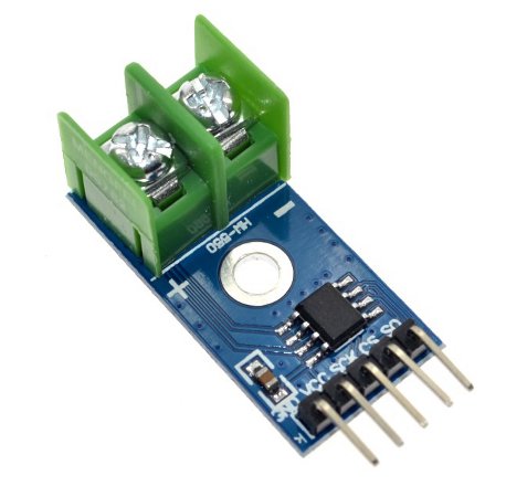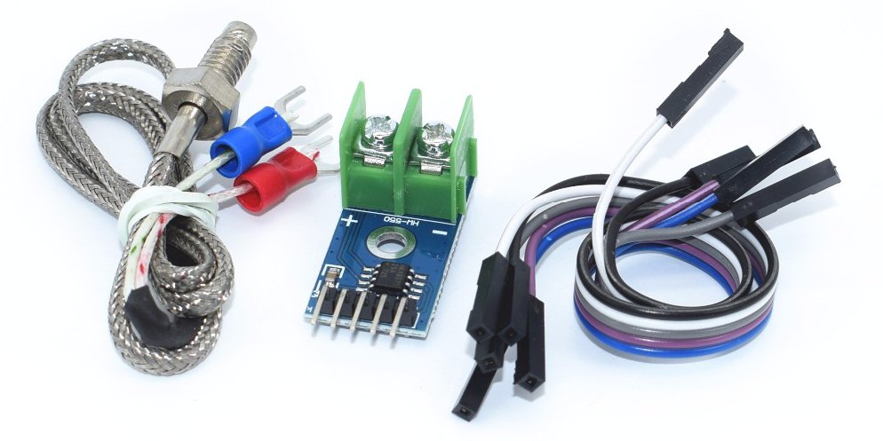 Модуль измерения температуры. Он состоит из электронного модуля с интегральной схемой MAX6675 производства Maxim, термопары типа К и соединительных кабелей. MAX6675 — аналого-цифровой аналого-цифровой преобразователь, предназначенный для цифрового измерения температуры. Аналоговый сигнал термопары (напряжение) преобразуется в цифровой сигнал, который можно считать с помощью микропроцессорной системы. Несомненным преимуществом MAX6675 является последовательный интерфейс SPI, поэтому использовать этот метод связи очень просто и в Интернете можно легко найти множество примеров различных типов прототипов микропроцессоров: Arduino, AVR, PIC и т.д.