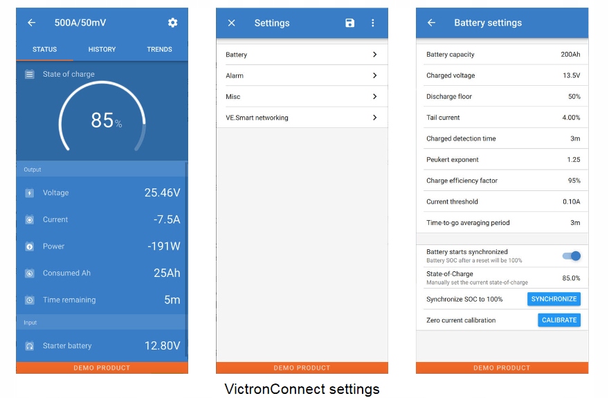 SmartShunt — это цельный монитор батареи, но без дисплея. Ваш мобильный телефон выступает в качестве дисплея. SmartShunt подключается через Bluetooth к приложению VictronConnect на вашем телефоне (или планшете), поэтому вы можете удобно считывать все отслеживаемые параметры батареи, например, состояние заряда, оставшееся время работы, исторические данные и многое другое.