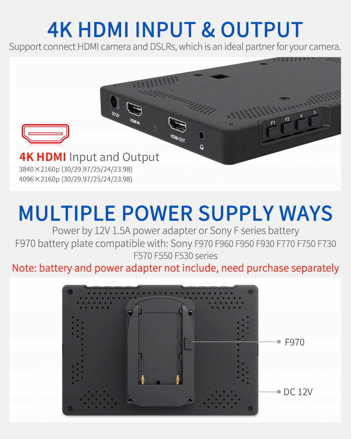 FEELWORLD T7 PLUS — 7-дюймовый Full HD монитор для работы с камерой. Он имеет корпус из алюминиевого сплава, прочный; простой в использовании интерфейс кнопок дает уверенность в работе; Поддерживает вход и выход 4K HDMI @ 30 Гц. Что касается функций, он обновляет форму сигнала, гистограмму, вектороскоп, 3D LUT на базовом T7. Предоставляет больше цветов и деталей экспозиции изображения, оптимизирует рабочий процесс и повышает эффективность работы.