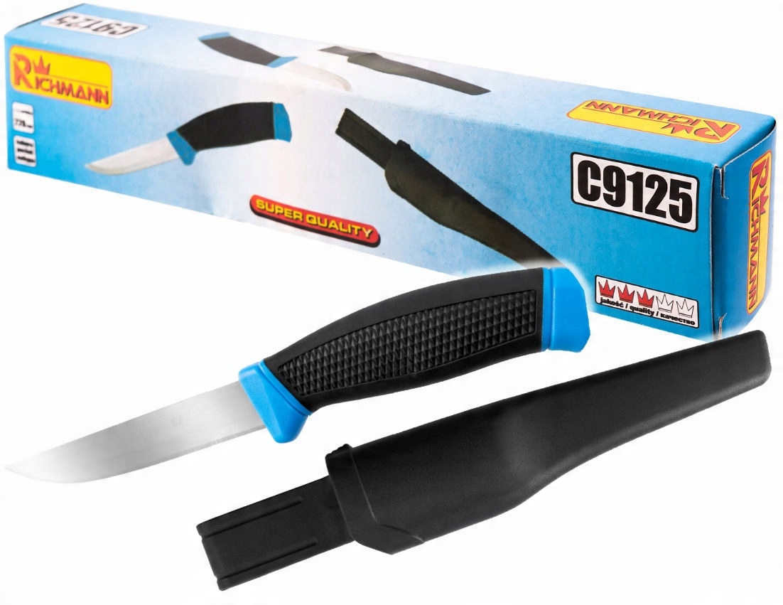 Нож общего назначения c9125 от Richmann b> с лезвием из нержавеющей стали с высокой агрессивностью. Нож имеет профилированную и эргономичную ручку в черном/синем. Нож оснащен черной пластиковой кобурой, которая, вероятно, защищает нож от случайной потери.