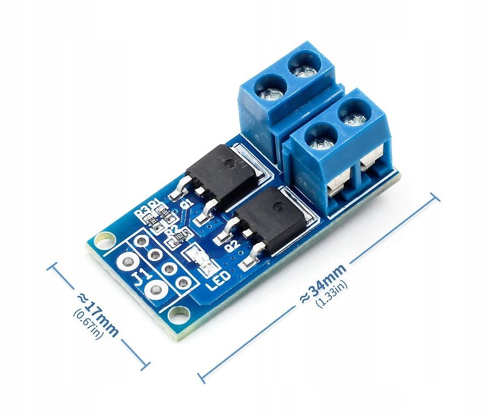 - применение: модуль может управлять электрическими устройствами, требующими большой мощности и больших токов, таких как например, двигатели, лампочки, светодиодные ленты, двигатели постоянного тока, насосы, электромагнитные клапаны, обогреватели и т. д., при управлении с помощью сигнала ШИМ они могут регулировать скорость вращения двигателя, яркость лампы и т. д.