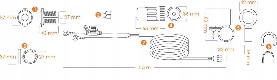 <р>2. плоские гнездовые разъемы с изоляцией <р>3. фиксирующее кольцо гнезда <р>4. адаптер розетки <р>5. крепление на руль <р>6. резиновые накладки на руль <р>7. силовой кабель с предохранителем