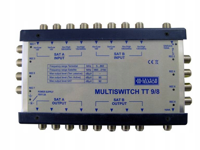 Каскадные мультисвитчи серии TT-9/xx — это устройства, позволяющие строить большие и очень большие коллективные установки. Новое постановление министра транспорта, строительства и морской экономики о технических условиях, которым должны соответствовать здания, налагает обязанность строить мультивыключатели в каждом новом многоквартирном доме. Мультисвитч, как каскадное устройство, имеет проходные выходы, к которым можно подключить другой мультисвитч, поэтому, используя семейство мультисвитчей TT-9xx, вы можете практически свободно масштабировать размер установки. Несомненным преимуществом каскадных мультисвичей TT-9xx является встроенная предварительная коррекция характеристики (наклон характеристики). Эта особенность устройств в сочетании с явлением увеличения затухания в кабеле с увеличением частоты позволяет добиться выравнивания уровней сигналов в абонентской розетке. Устройства позволяют масштабировать сеть за счет добавления дополнительных мультисвитчей в каскад. Последний мультипереключатель в каскаде должен быть оконцован терминаторами DC BLOCK 75 Ом, которые необходимо приобрести дополнительно.