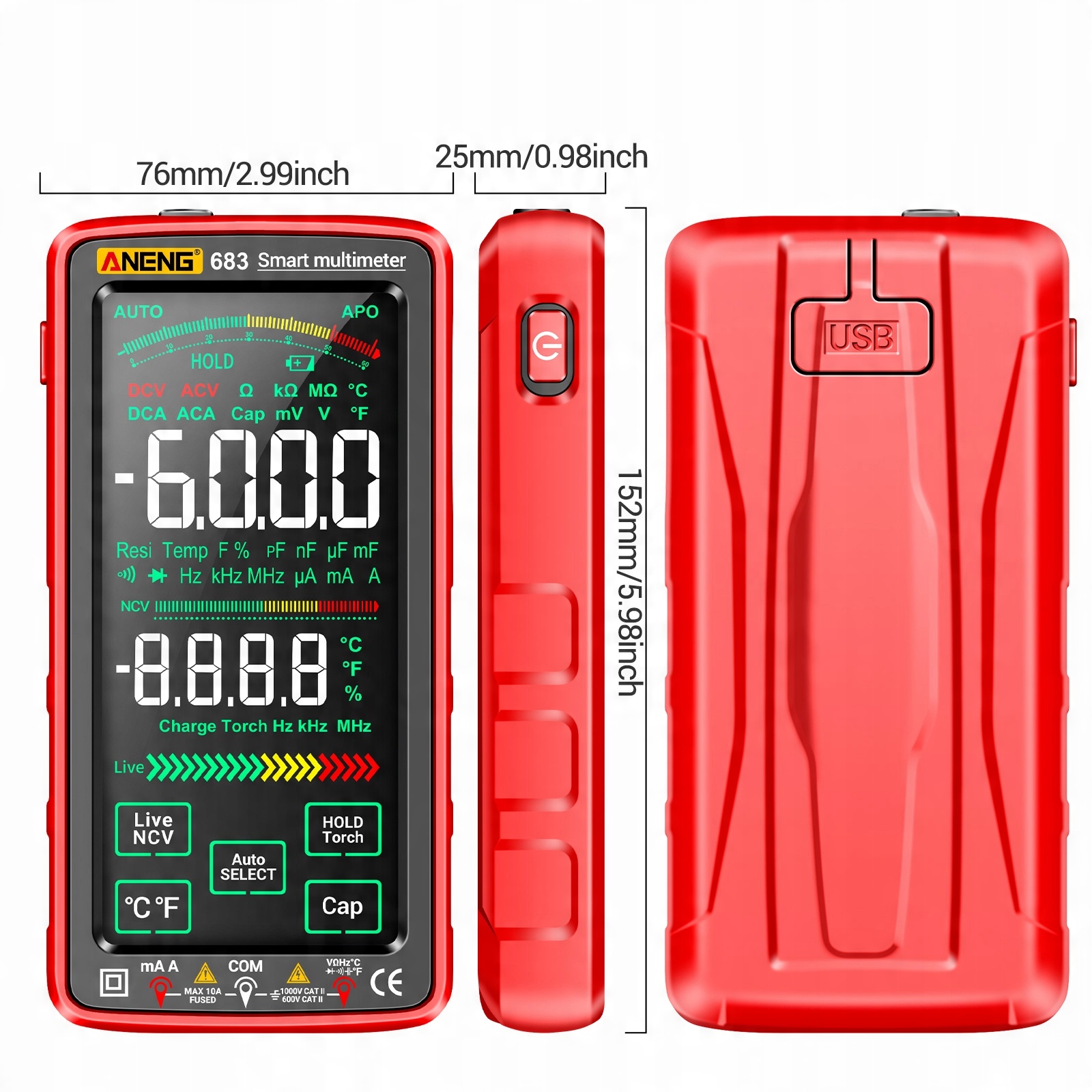 Сенсорный экран и цветной ЖК -дисплей VA с перевернутым экраном: сенсорный экран с интеллектуальным датчиком, простым в использовании. Инвертированный цвет VA -дисплей и макс. 6000 подсчетов. Отображение, с функцией остановки данных, очистите, чтобы прочитать измеренное значение в различных рабочих сред.