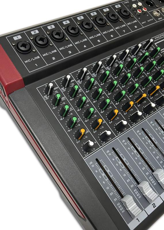 Профессиональный миксер, 6 моно входов, 1 стерео вход. На каждом входе есть 3-полоса. Уравнение, фантом 48В. Он имеет встроенный 32-битный процессор DSP с 16 дополнительными предварительными настройками.