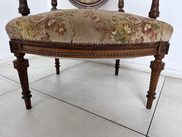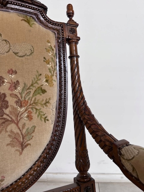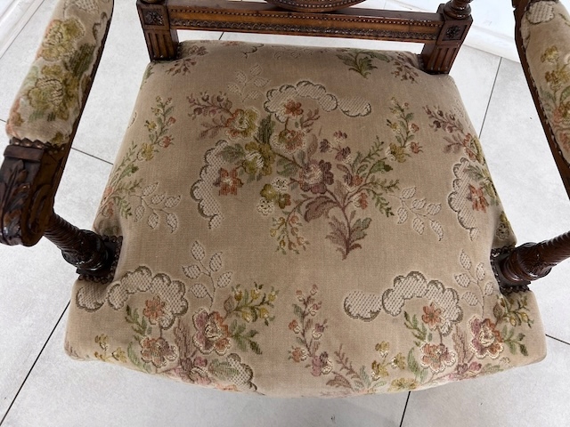 Кресло, трон, 2 шт. Эффективно. Очень красивый, богато украшенный. Обито жаккардовой тканью бежевого цвета. Оба в хорошем состоянии. В одном кресле не хватает двух небольших элементов. Других повреждений и дефектов нет. Сиденья удобные и устойчивые. Они готовы к вставке.