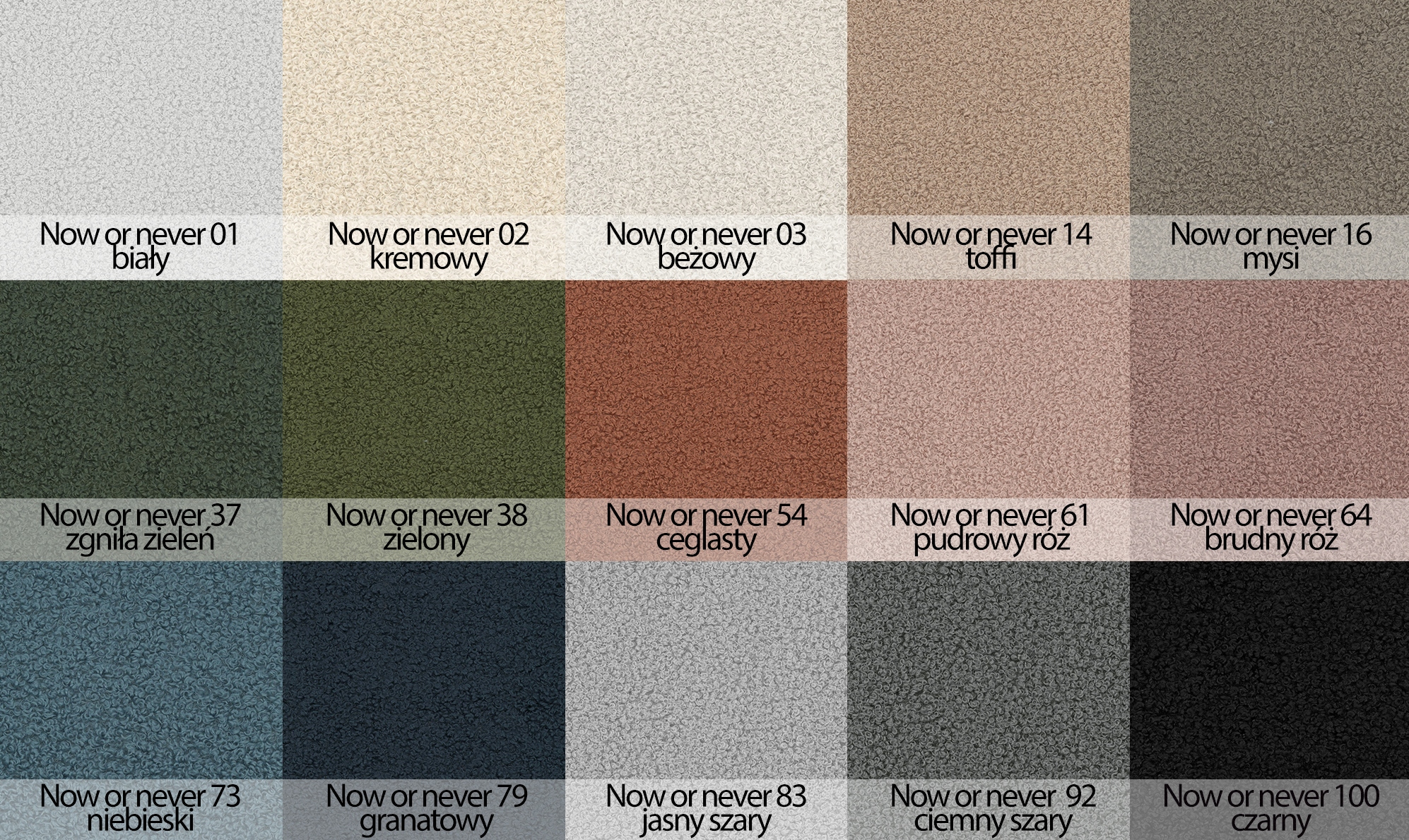 сейчас или никогда - обивочная ткань с характерной текстурой петли, которая создается использованием пряжи различной толщины и напряжения, что дает влияние небольших ударов или грани на ее поверхности. Boucle сейчас или никогда не является идеальным решением для людей, ищущих комбинацию функциональности с роскошным дизайном.