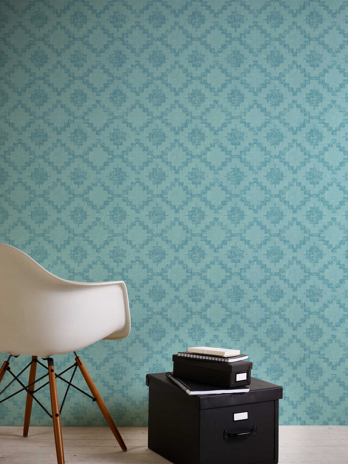 Современные обои с геометрическим рисунком ромбов на мятном фоне, создающим трехмерный эффект на стене.