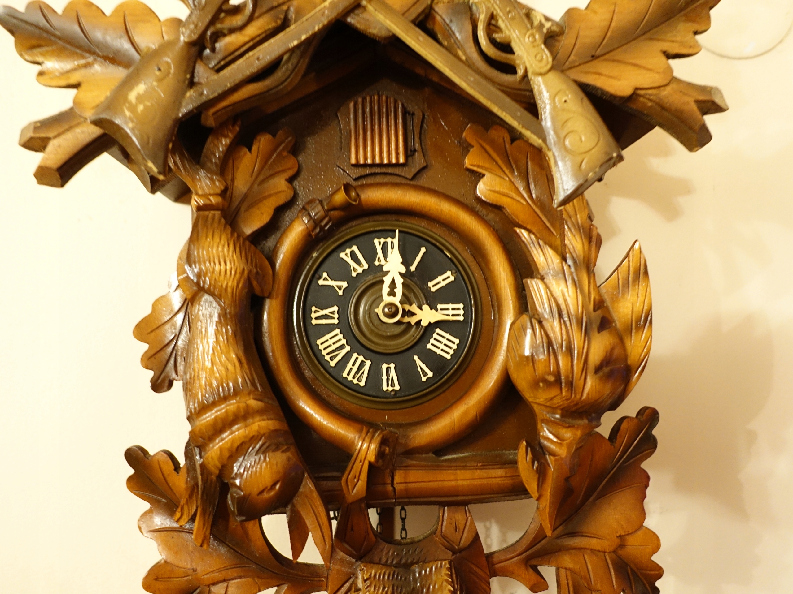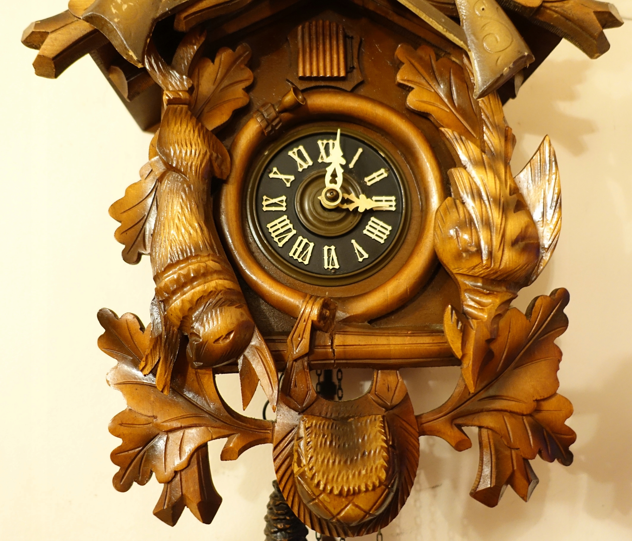 Кукушка и часы отбивают пол часа молотком на спиральном гонге
