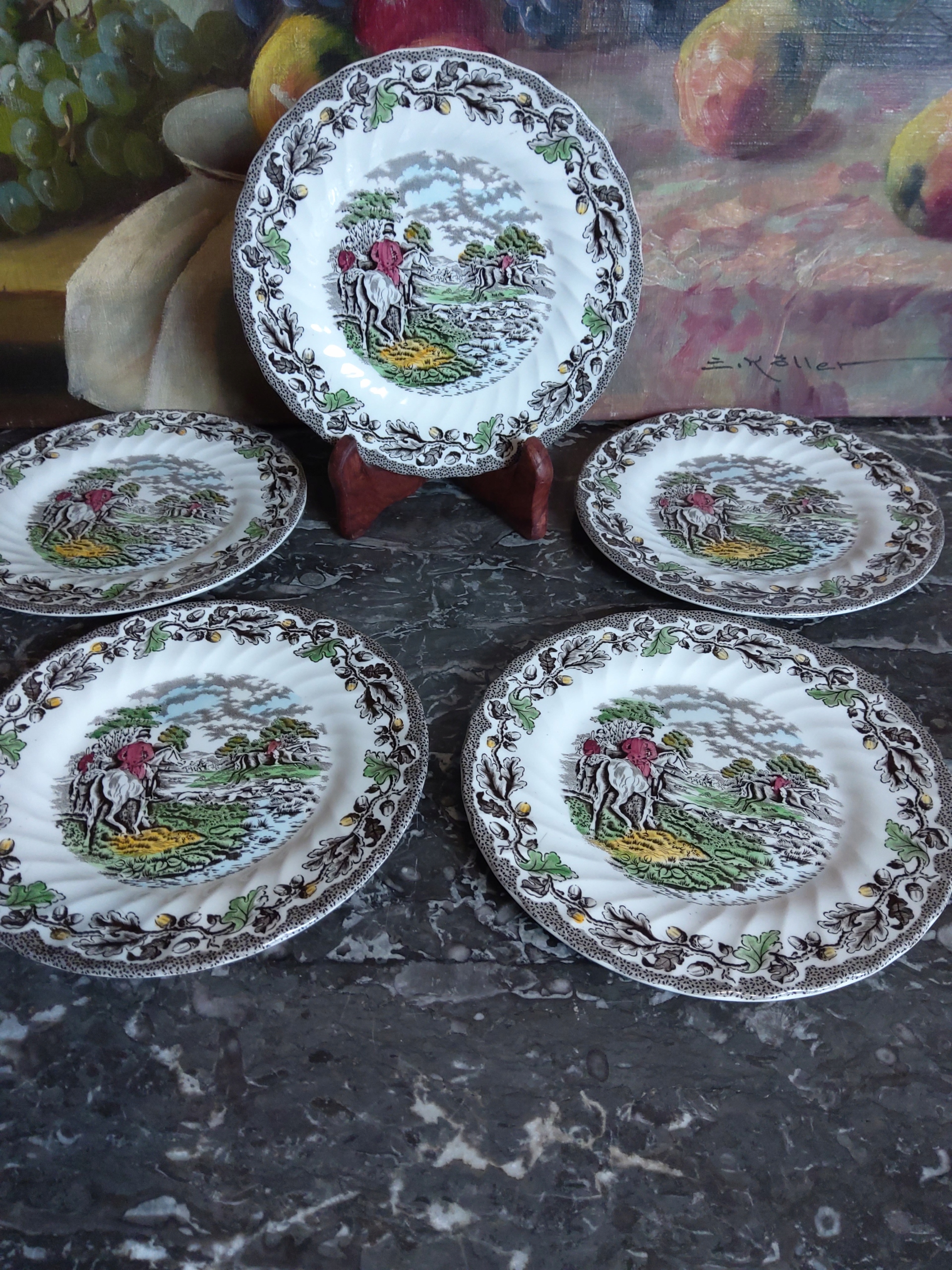 Набор из 5 тарелок диаметром 19,5 см от английского производителя Myotts Country Life, английские сюжеты. Подглазурный декор ручной работы. Красочный мотив равномерен на всех тарелках. Очень декоративный фарфор. Состояние идеальное, без дефектов. Рекомендую.