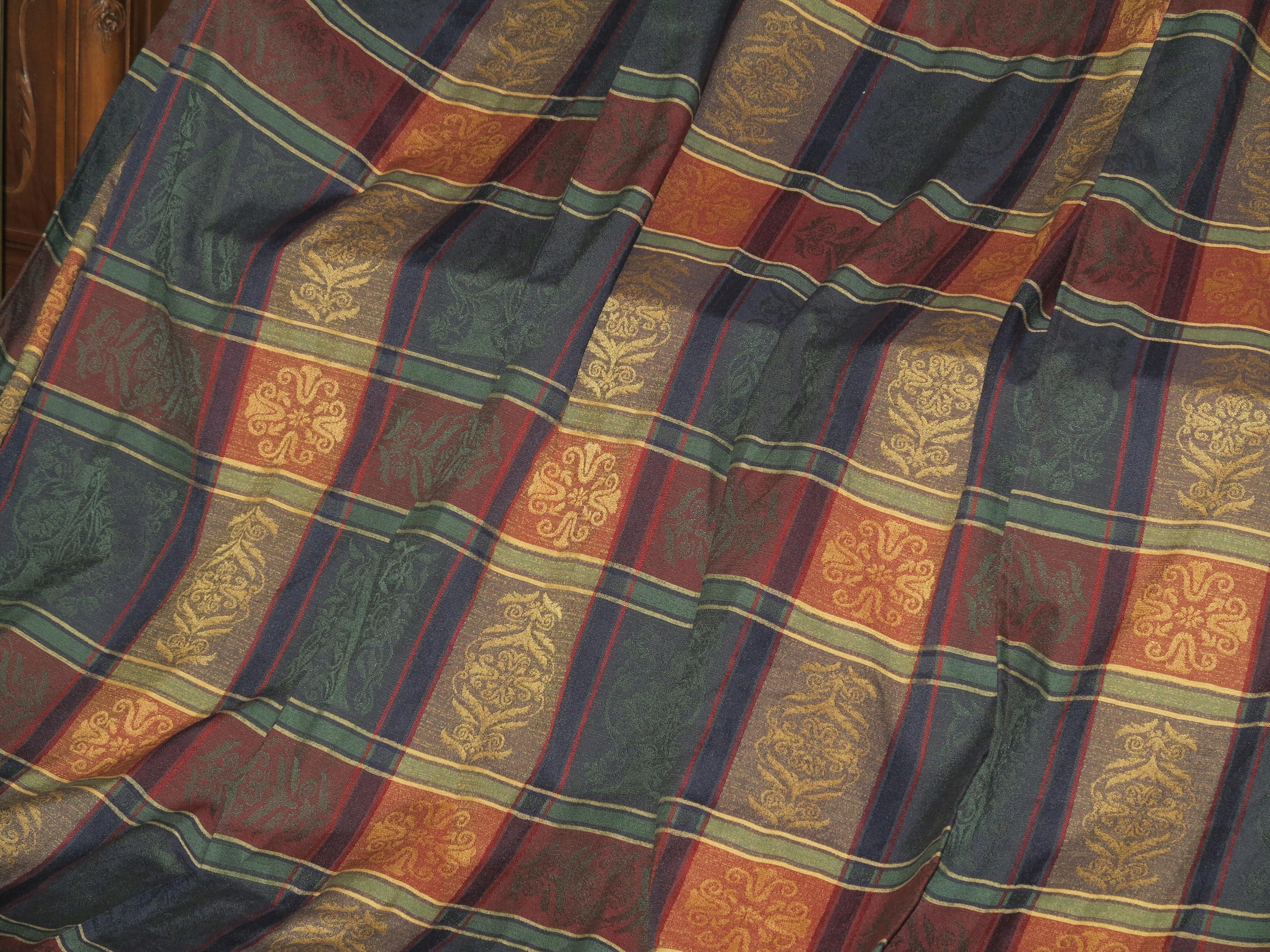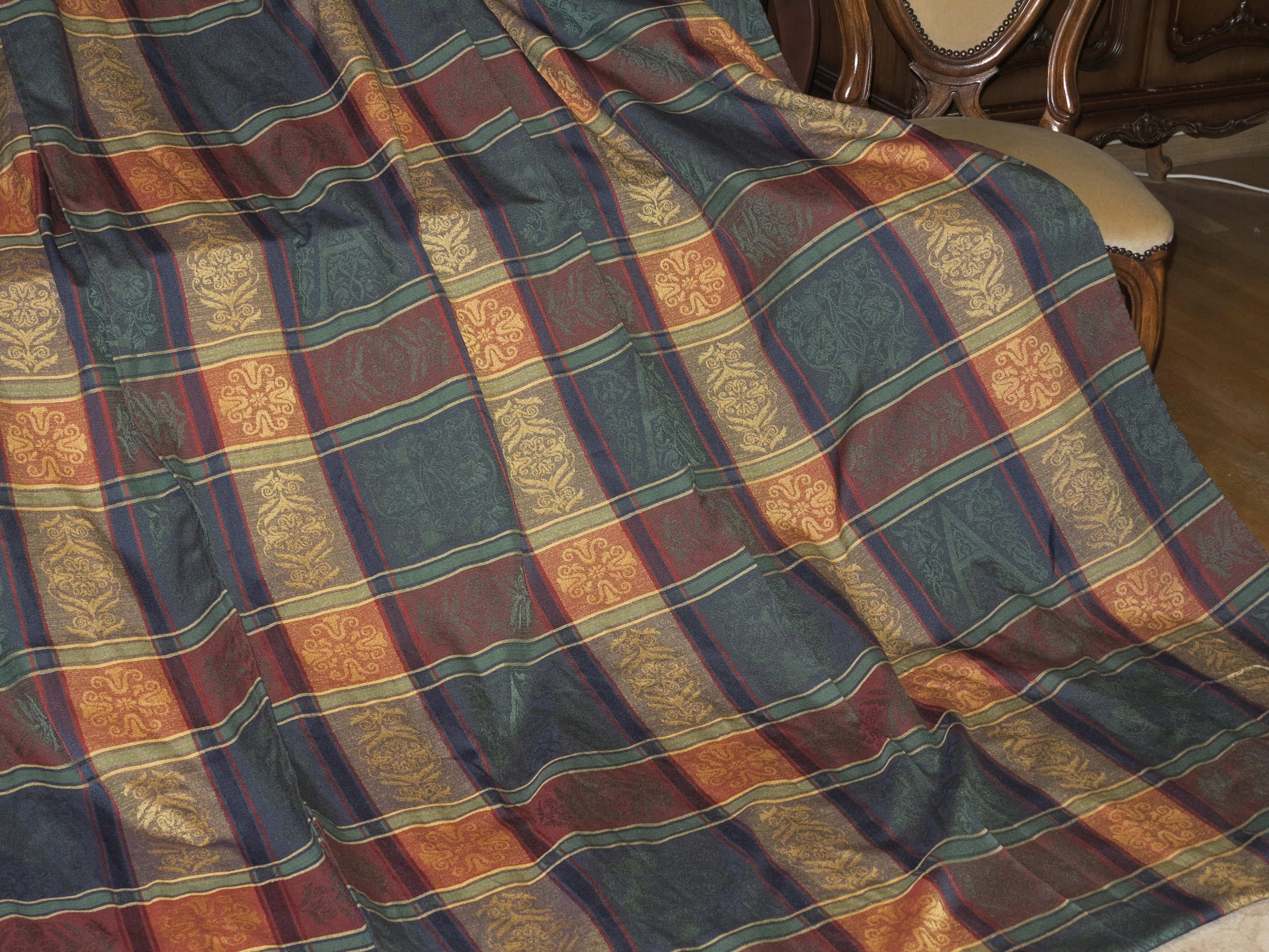 ДЛЯ АНТИКВАРИАТА - КРАСИВЫЕ АНГЛИЙСКИЕ ШТОРЫ СО СТИЛЬНЫМИ ПОЛОСАМИ И СТЕМАННЫМИ УЗОРАМИ. ПОЛОСКИ ТЕМНО-ЗЕЛЕНОГО, ЗОЛОТОГО, НОРЫ. НА ТКАНИ ДОПОЛНИТЕЛЬНО ПРОТИВАН ЗОЛОТОЙ УЗОР. НА ЗЕЛЕНЫХ КВАДРАТАХ БУКВЫ «А» И «Л».