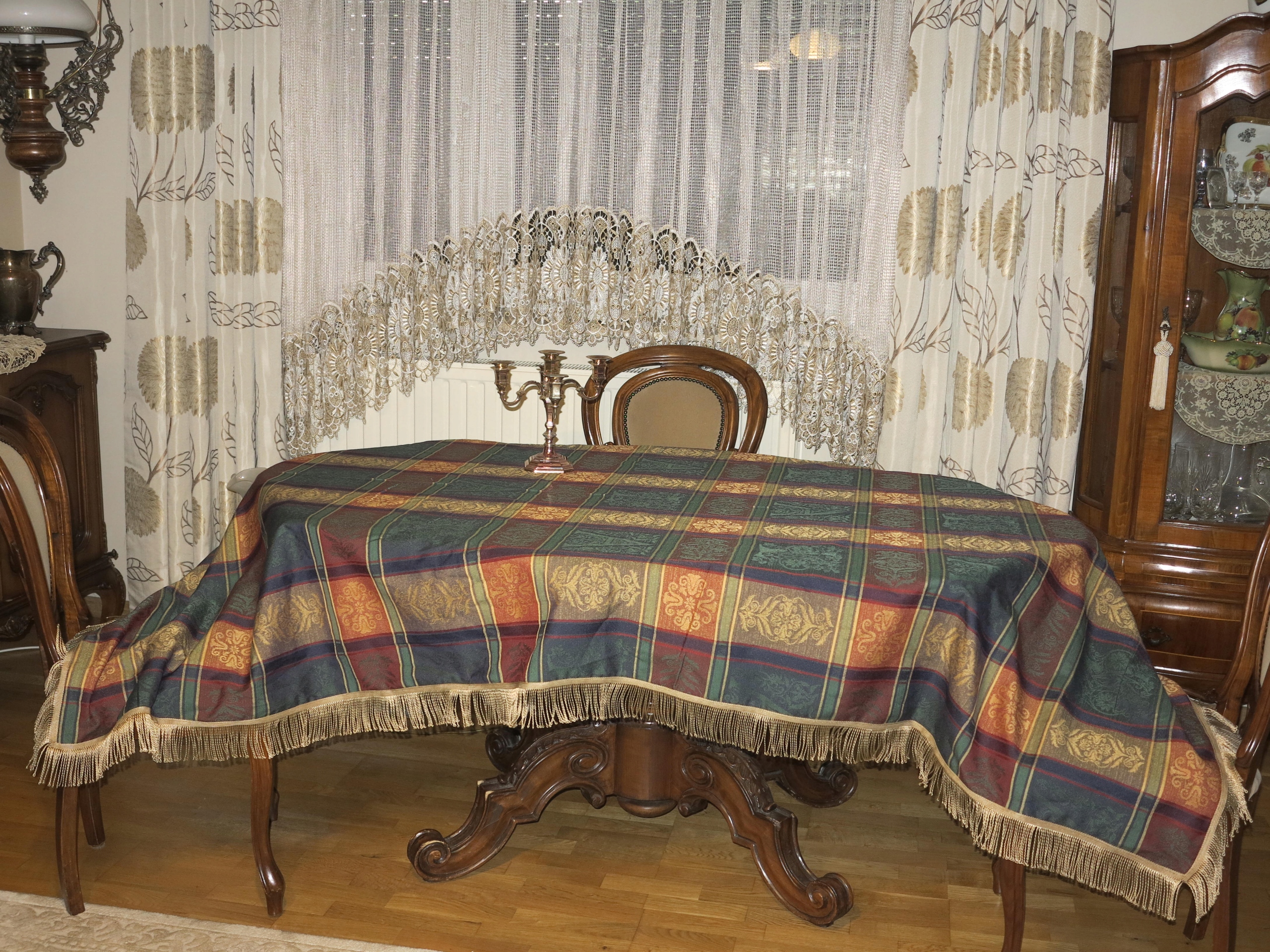 Предмет аукциона – необыкновенно красивая, стильная скатерть из плотной, прочной и очень добротной жаккардовой ткани с полосками Людвик. Красивая бахрома вокруг. Размеры скатерти: 244/138см + бахрома 7см. Скатерть б/у, но в отличном состоянии и качестве, честно рекомендую.
