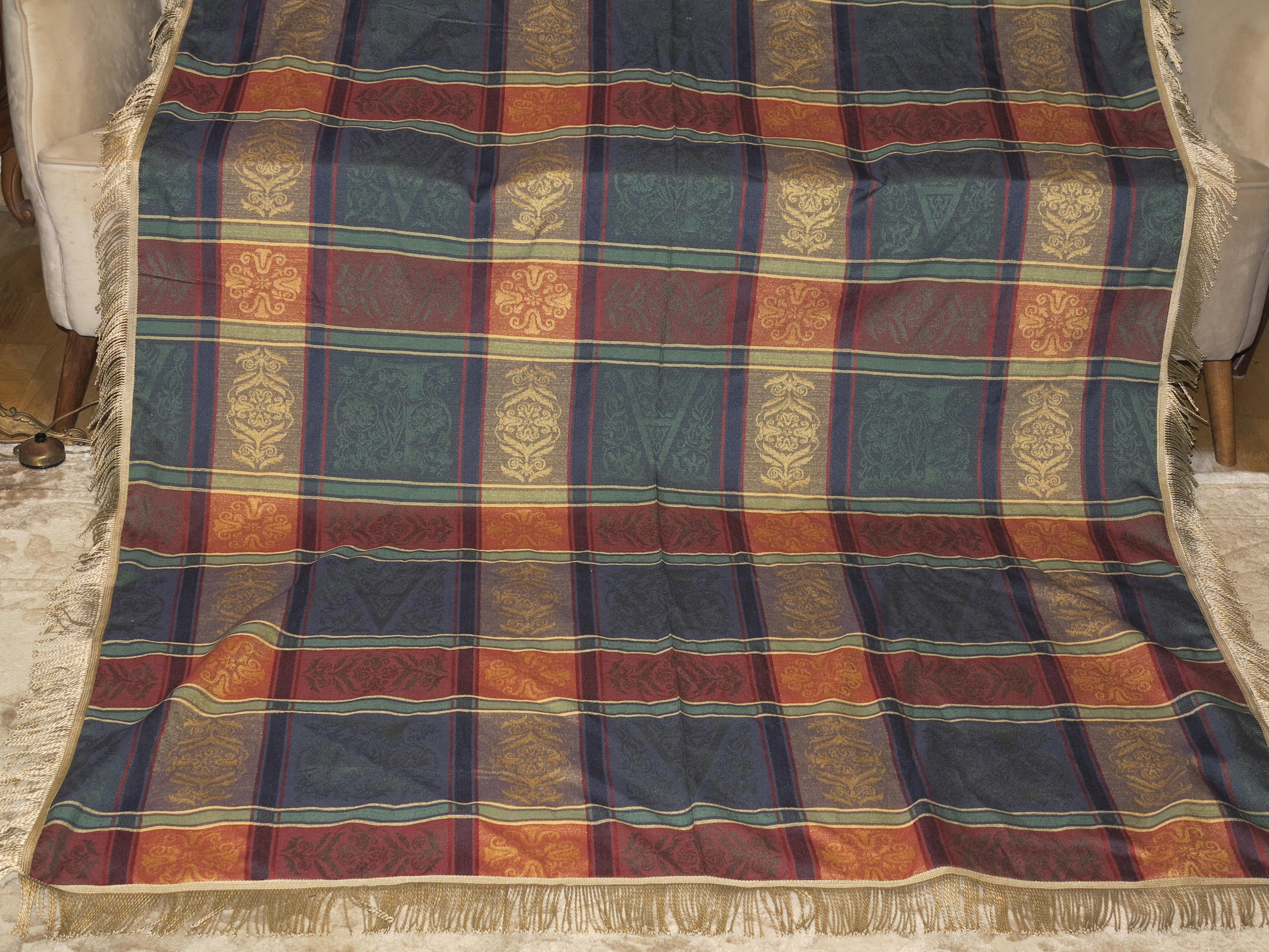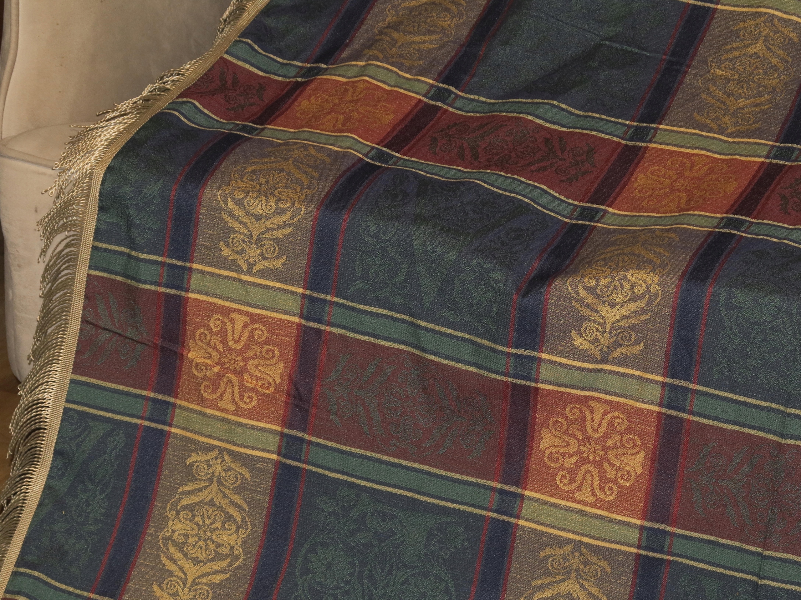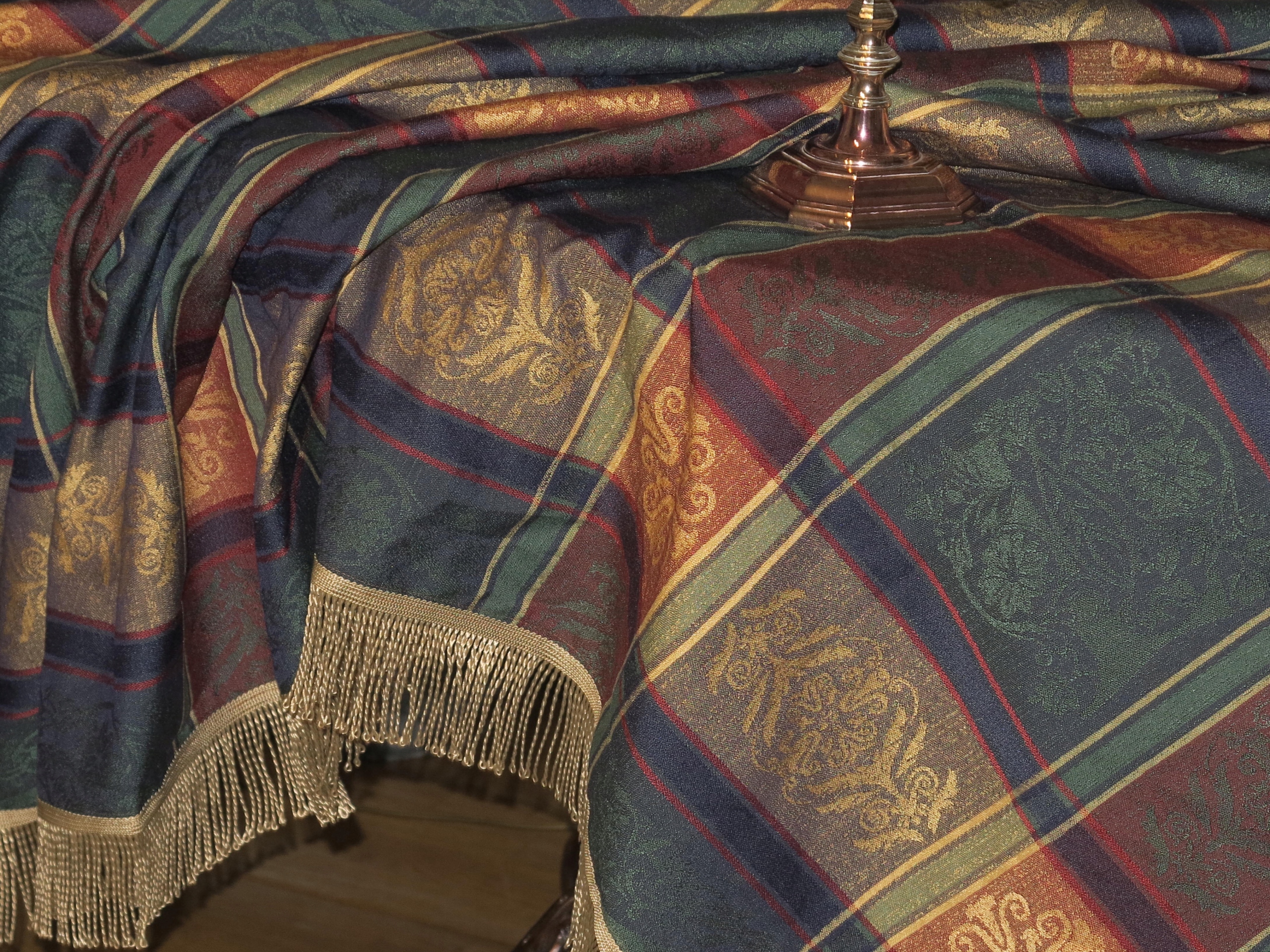 ДЛЯ ЗНАЧИТЕЛЯ - НЕОБЫЧАЙНО КРАСИВАЯ, СТИЛЬНАЯ БОЛЬШАЯ СКАТЕРТЬ ИЗ ОТЛИЧНОГО КАЧЕСТВА ЖАККАРДОВОЙ ТКАНИ С ЛЮДВИКОВЫМИ ПОЛОСАМИ, В НОРНОМ, ЗОЛОТОМ, ЗЕЛЕНОМ И ТЕМНО-СИНЕМ ЦВЕТАХ. ДОПОЛНИТЕЛЬНО УКРАШЕН СТИЛЬНЫМ УЗОРОМ И БУКВАМИ. ЗОЛОТАЯ БАХРА ВОКРУГ.