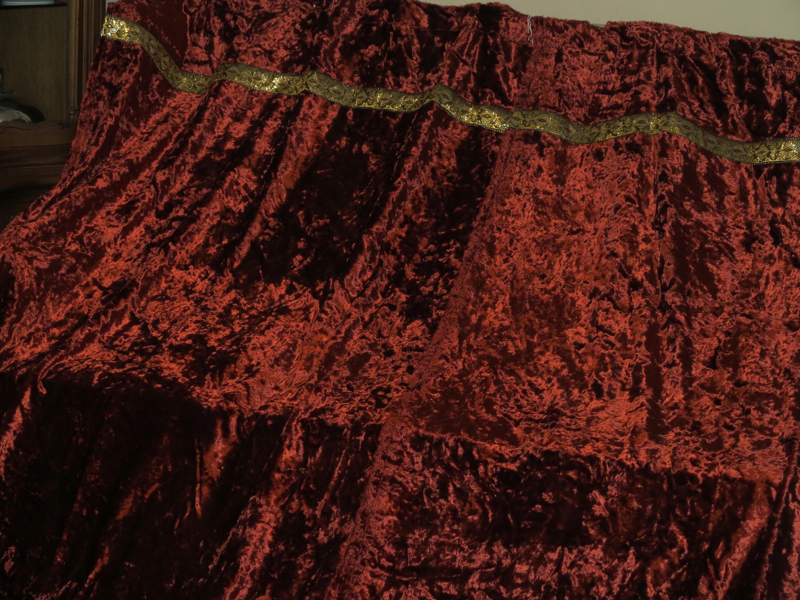 ДЛЯ АНТИКВАРИАТА - НАБОР НЕОЧЕНЬ КРАСИВЫХ ШТОР - BLACKOUT ШТОР ИЗ ПЛОТНОГО ХЛОПКА И СИНТЕТИЧЕСКОГО БАРХАТА В КОРОЛЕВСКОМ БОРДОВОМ ЦВЕТЕ. СВЕРХУ УКРАШЕНЫ ШИРОКОЙ ЗОЛОТОЙ ДЕКОРАТИВНОЙ АНТИЧНОЙ РЕЗИНКОЙ.
