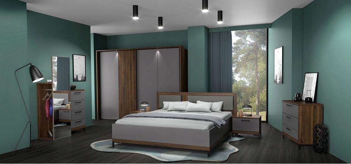 Уютно и элегантный. Именно такое впечатление создает коллекция мебели QUETORE в контрастных декорах Орех Бейкерсфилд и матовом глубоком сером. В комплект входят кровать и вместительные шкафы с раздвижными дверцами. Также мы позаботились об еще одном важном предмете мебели в спальне - туалетном столике с зеркалом и комоде с зеркалом и ящиками, на которых можно красиво выставить бутылку ваши любимые духи или впечатляющая подставка для драгоценностей. Все выдержано в простой, геометрической форме, предназначенной для любителей современных интерьеров.