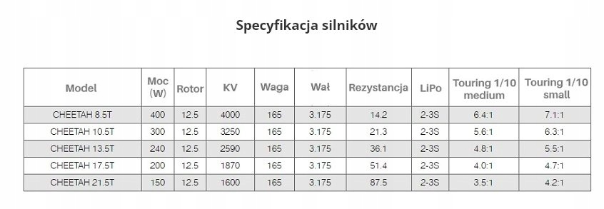 Приводные комплекты SkyRC Cheetah предлагаются в пяти комбинациях двигателей, поэтому каждый пользователь найдет для себя подходящую конфигурацию. Версии двигателя: 8,5Т - 4000 КВ, 10,5Т 3250 КВ, 13,5Т - 2590 КВ, 17,5Т - 1870 КВ, 21,5Т - 1600 КВ
