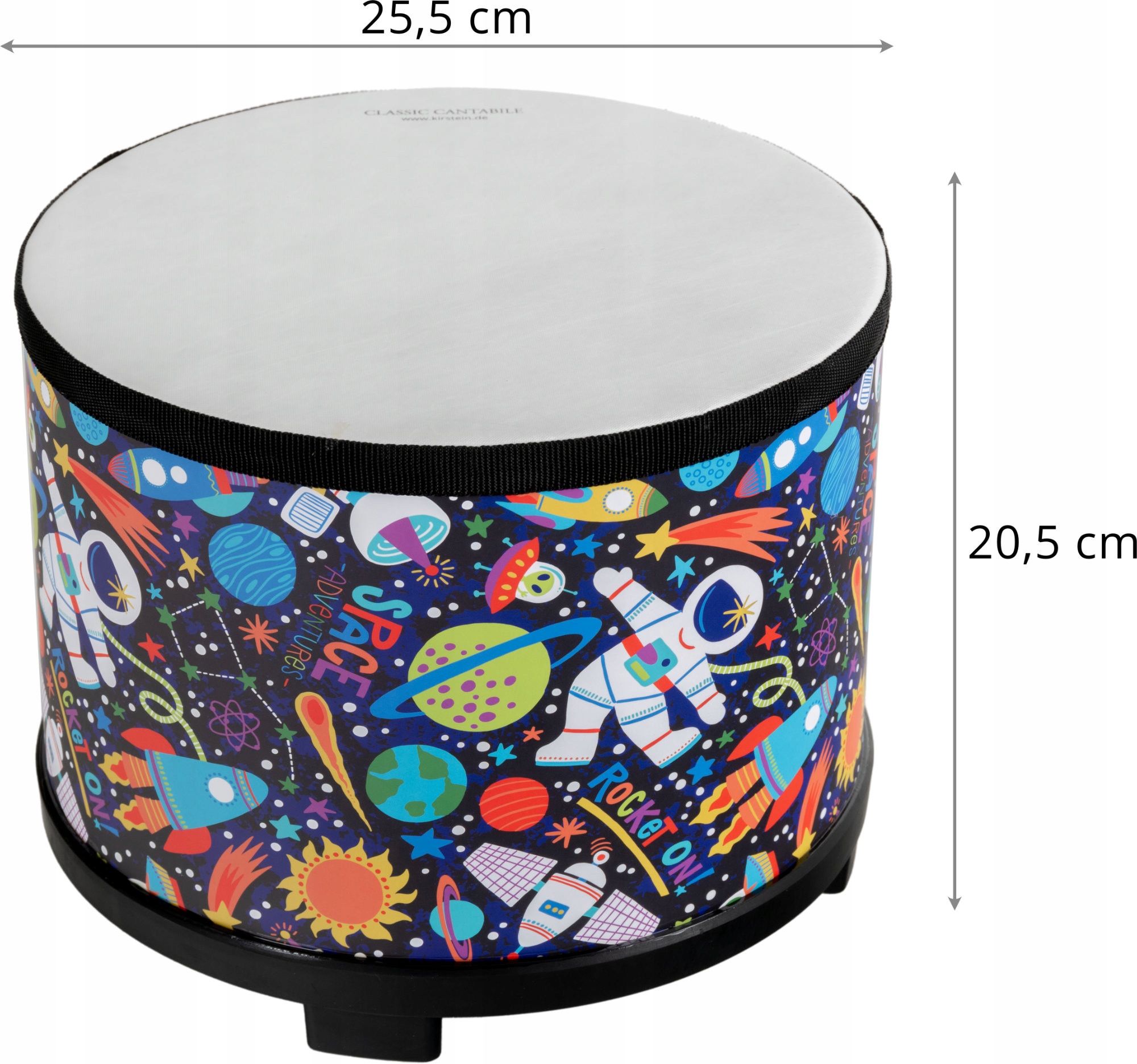 Дизайн Colorful Space привносит цвета в каждую детскую комнату. Верхняя часть барабана покрыта нейлоновой лентой для предотвращения острых краев. Нижнее кольцо из мягкого пластика также имеет четыре ножки, которые позволяют воздуху выходить во время игры, и барабан звучит великолепно, даже если положить его на пол. Конечно, есть и соответствующие дубинки. Этот барабан порадует маленьких исследователей с 3 лет и обеспечит отличную игру дома, в детских садах и музыкальных школах.