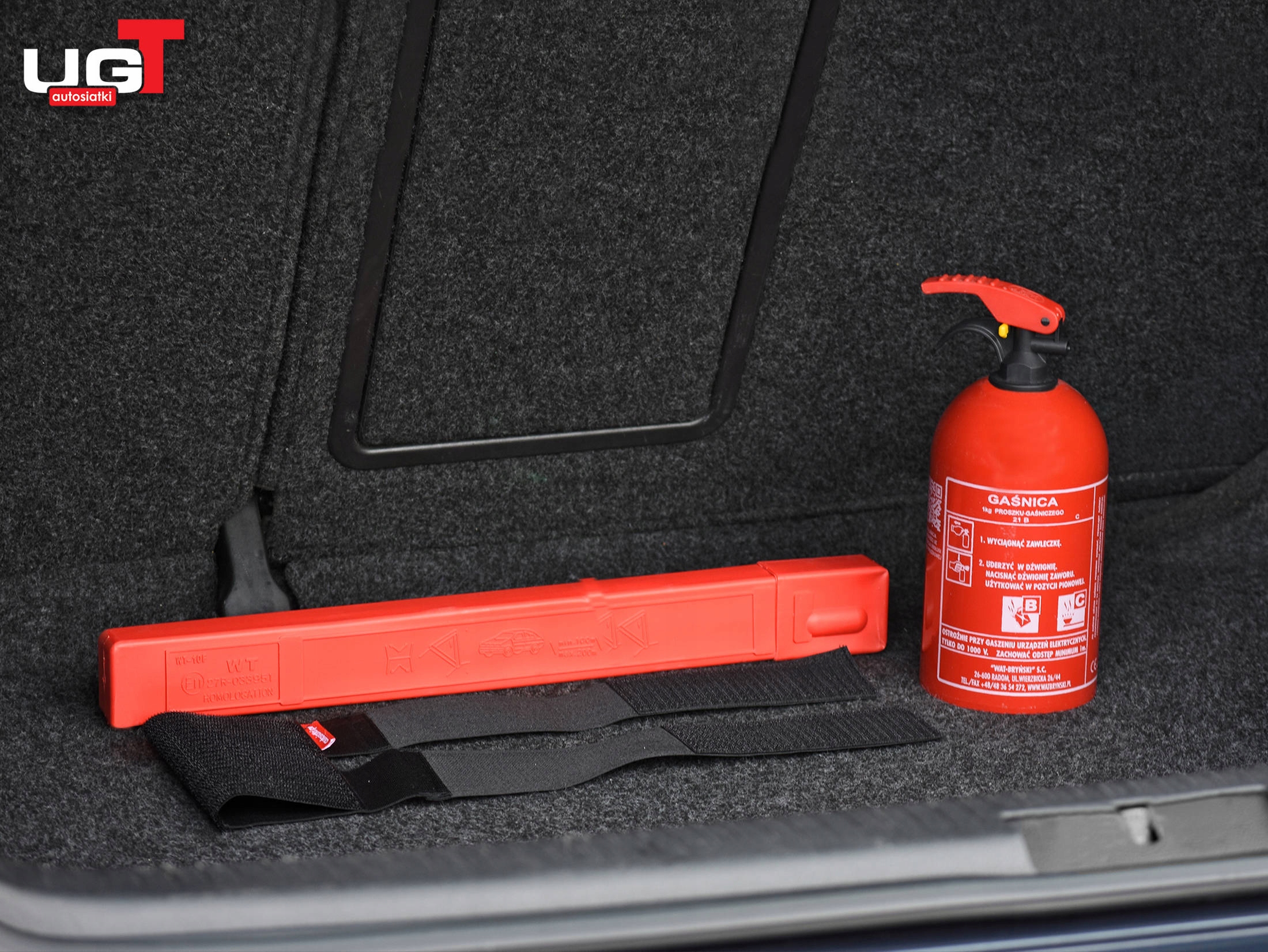 Комплект крепится к ковру с помощью прочной ленты-липучки. Благодаря этому мы можем быстро и легко закрепить огнетушитель и треугольник от смещения. Используемые материалы позволяют установить в любом месте обивки без необходимости сверления.