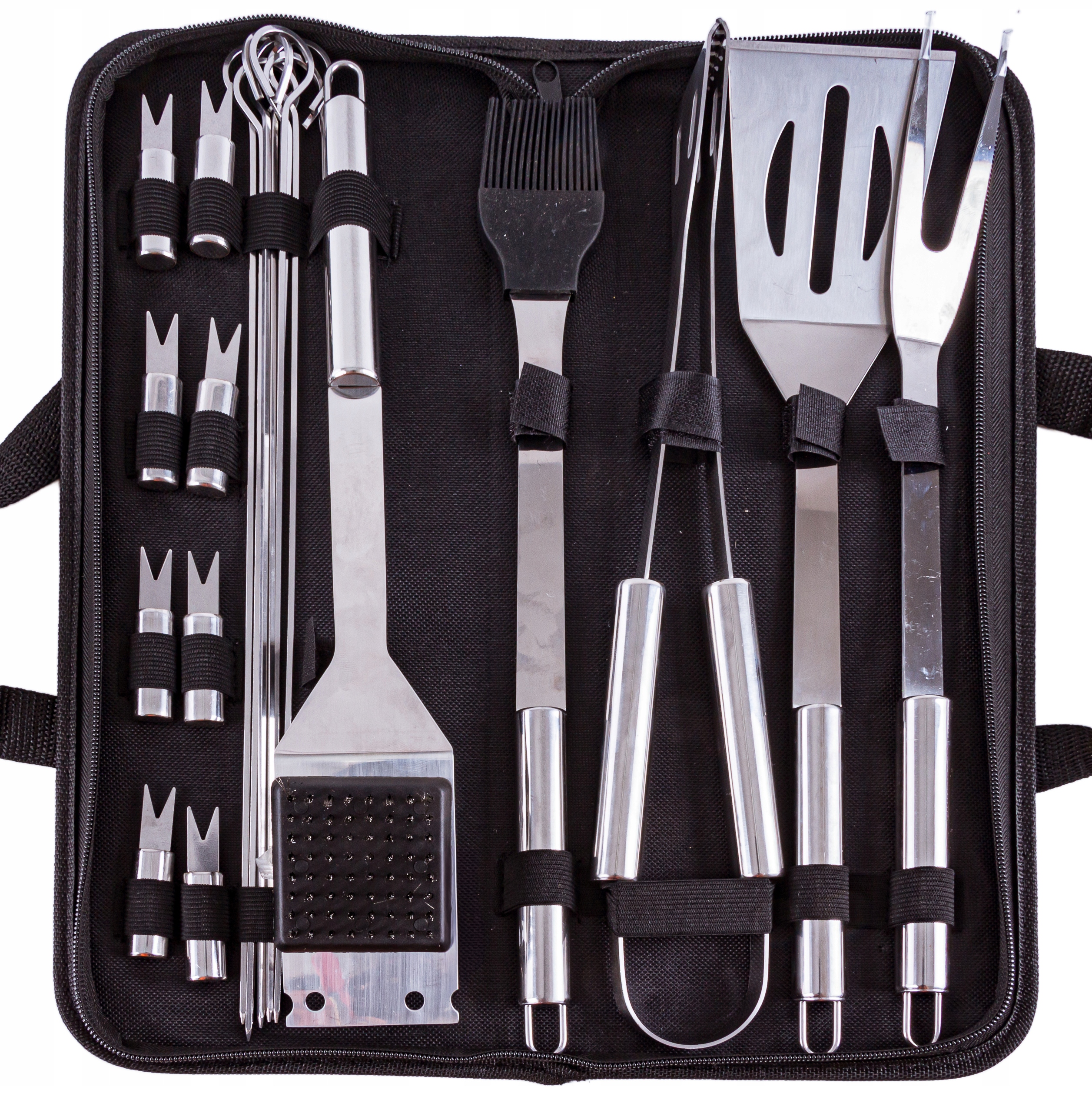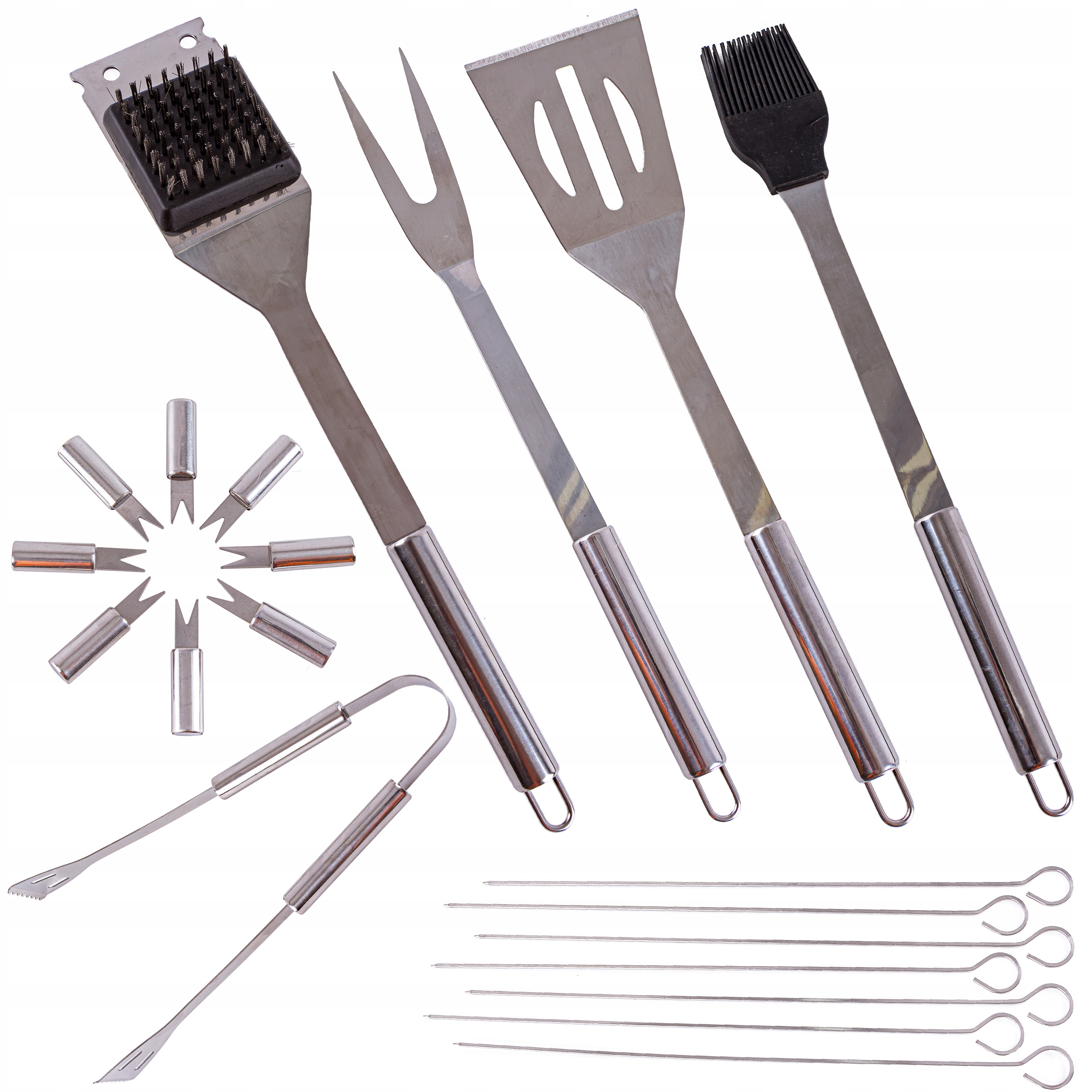 В нашем наборе 20 тщательно отобранных принадлежностей для гриля, изготовленных из нержавеющей стали высочайшего качества. Каждый элемент был разработан с учетом функциональности, долговечности и удобства использования.