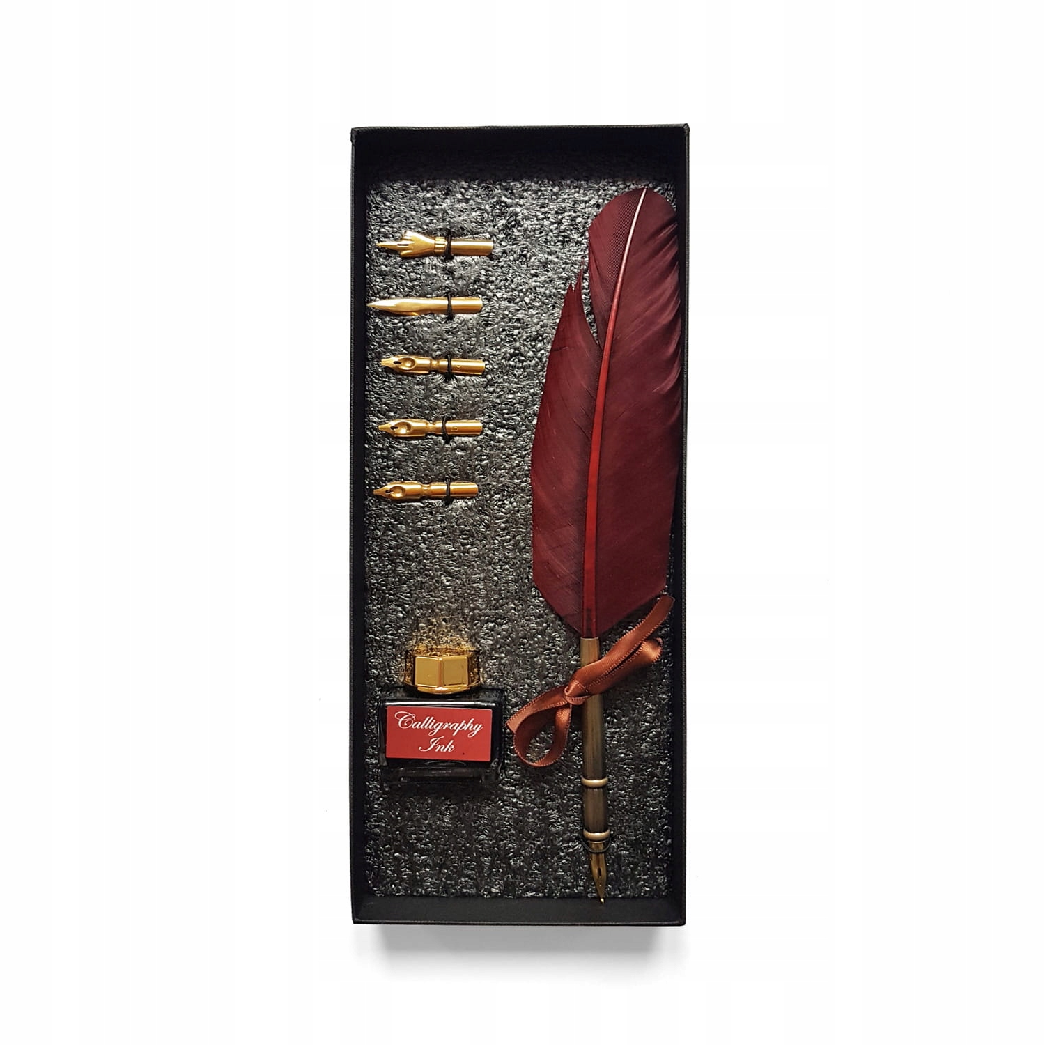 Набор для каллиграфии AMI состоит из металлического держателя с красным гусиным пером, черными чернилами для каллиграфии и 6 позолоченными перьями.