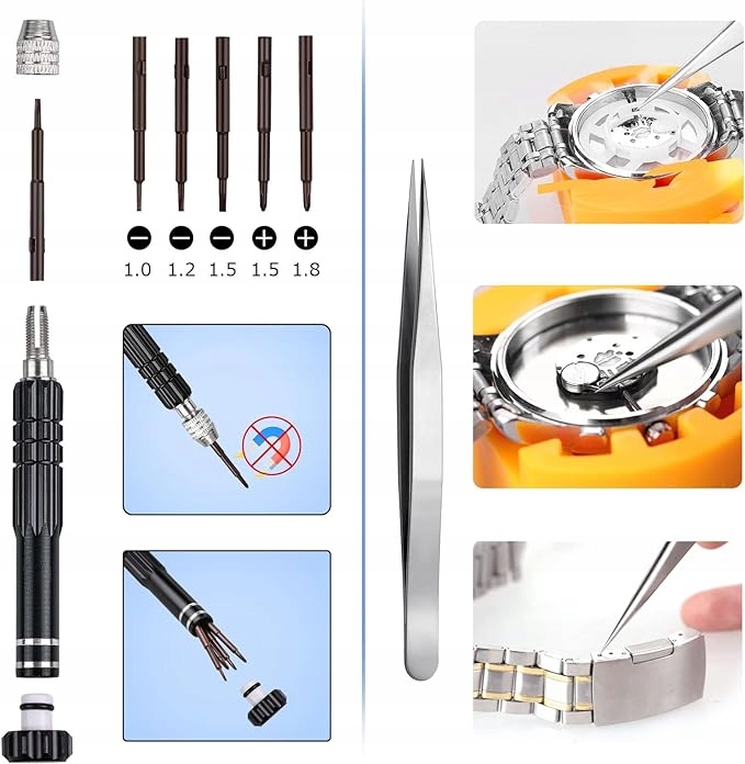 - 【Отвертка для часов «Пять в одном»】 — Пять типов насадок для отверток подходят для многих ситуаций: для ремонта батареи часов, для корпуса часов, для ремешка часов, а также для ремонта часов. можно использовать для очков. Крышку на конце отвертки можно открыть, и внутри пусто для хранения других насадок.