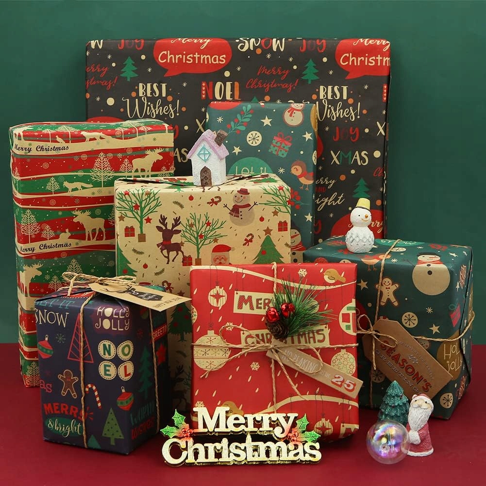 Рождественская упаковочная бумага изготовлена из высококачественной крафт-бумаги, гладкая поверхность, плотная, из экологически чистых материалов, без запаха, 100% пригодна для вторичной переработки, экологически чистая.