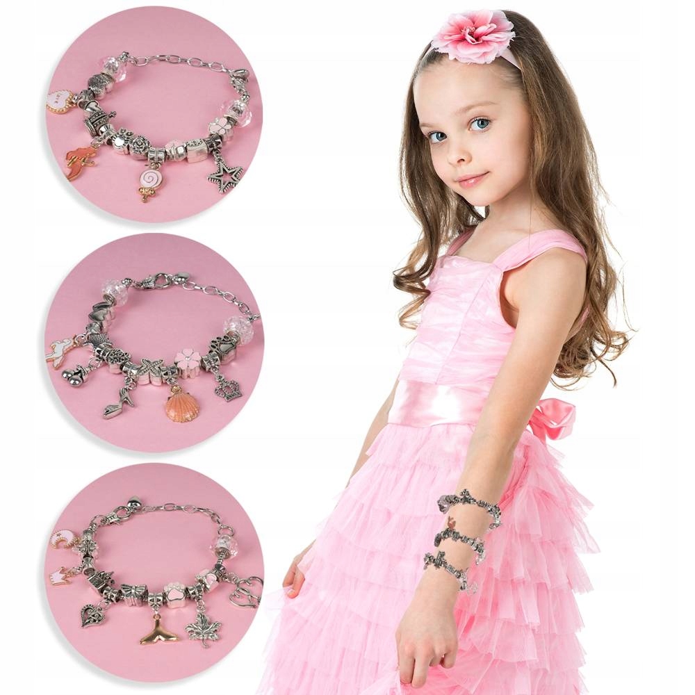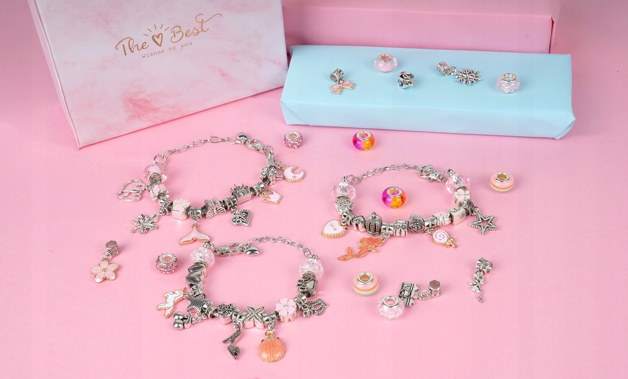 В набор входят стеклянные, смоляные и металлические бусины различной формы, а также металлические бусины с различными подвесками. Все элементы можно нанизать на один из трех браслетов, регулируемых по длине.