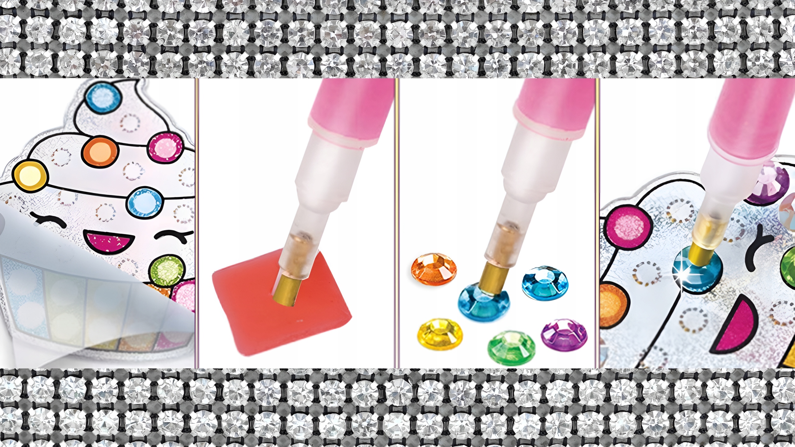 — самая модная творческая забава для детей в этом сезоне. Набор позволяет создавать красивые узоры из бриллиантов сказочной окраски. Игра заключается в выборе ромбов подходящего цвета и переносе их на шаблон с помощью клея с помощью специальной ручки. Расположив элементы, получаем красивое, красочное украшение. С помощью пластиковых подставок и силиконовых присосок с крючками, входящих в комплект, готовые работы можно разместить, например, на столе, на полке, повесить на окно, зеркало или использовать для украшения любимого блокнота, портфеля или дневник.