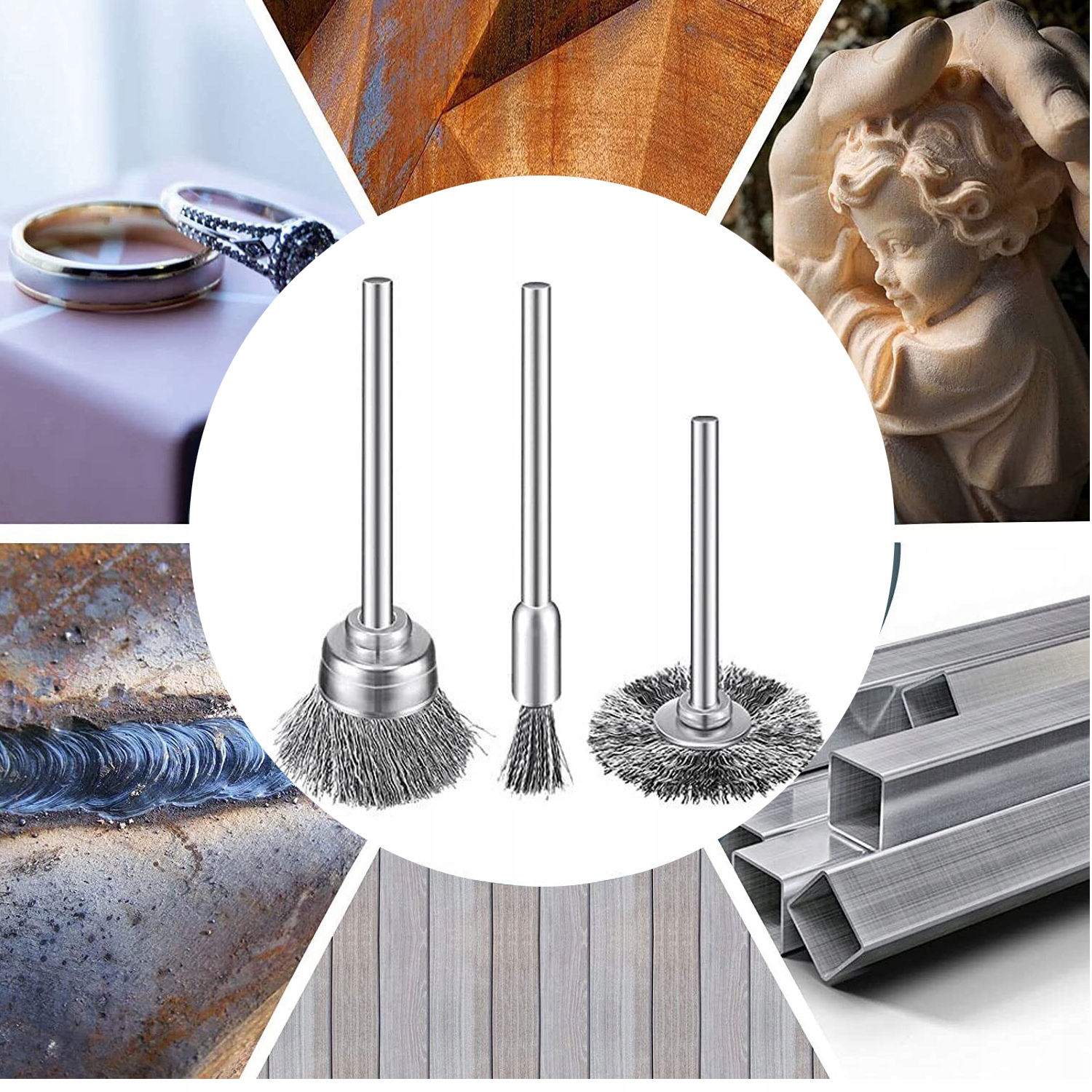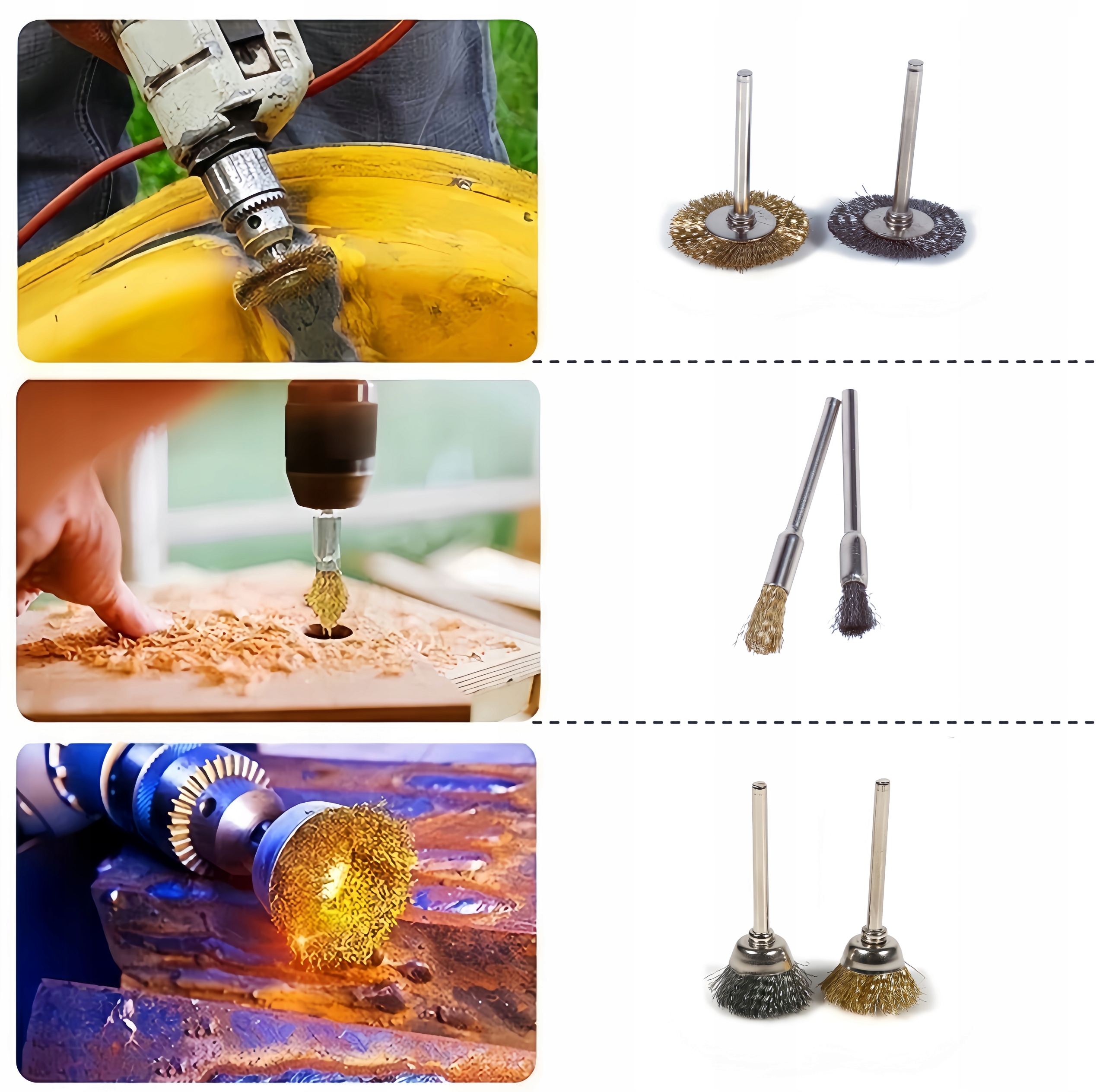 Набор проволочных щетков для тренировки для инструмента, используемого для очистки поверхности с помощью сверла или другого инструмента вращения. Стебель, который является переключателем с держателями сверления