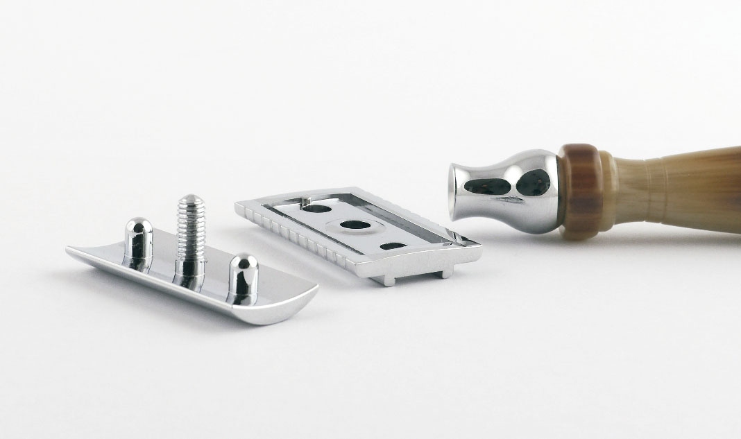 Традиционная бритва Frank Shaving, состоящая из трех частей, с лезвиями идеально ложится на щеточку. Режущая кромка расположена с обеих сторон бритвенной головки и покрыта глянцевым хромом. Тип головы – так называемый закрытая гребенка. Бритвы этого типа идеально подходят для повседневного бритья и более щадят кожу.