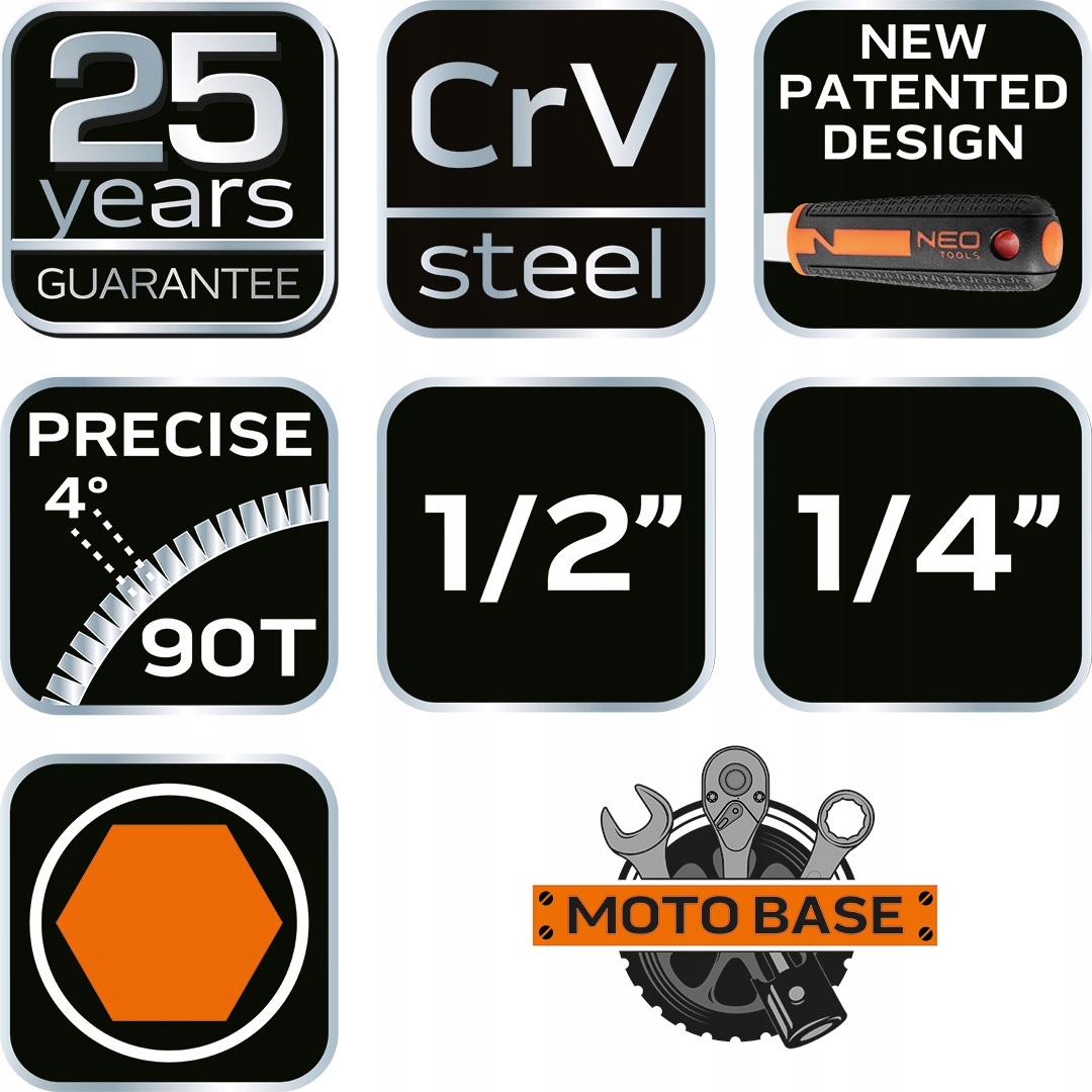 Набор торцевых ключей NEO 1/2" и 1/4" (арт. № 10-062) состоит из 94 элементов, изготовленных из высококачественной хромованадиевой стали. В комплект входят изогнутые трещотки 1/2" и 1/4" (90 зубцов) с эргономичной ручкой. В комплект входит богатый набор головок (размерами от 4 до 32 мм) и насадок (плоские, крестовые, шестигранные, Torx). Его дополняет широкий выбор аксессуаров. Поставляется все в прочном и практичном чемодане из пластика. Надежность изделия подтверждена 25-летней гарантией. Бренд NEO оправдывает ожидания профессионалов.