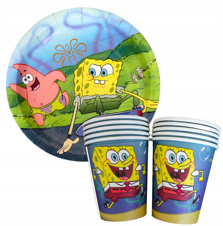В комплект входят: 10 тарелок и 10 кружек с мотивом Губки Боба.