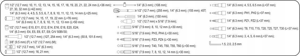Набор инструментов STHOR состоит из 108 элементов, помещенных в удобный пластиковый кейс. Инструменты изготовлены из материалов, обеспечивающих их надежность. В комплект входит полный набор длинных и коротких головок 1/4" и 1/2", удлинители, кардан и множество других элементов, в том числе трещотки с 45 зубьями. Такая конфигурация делает набор пригодным для мелких сборочных работ, механического ремонта и многих других работ в доме или мастерской.