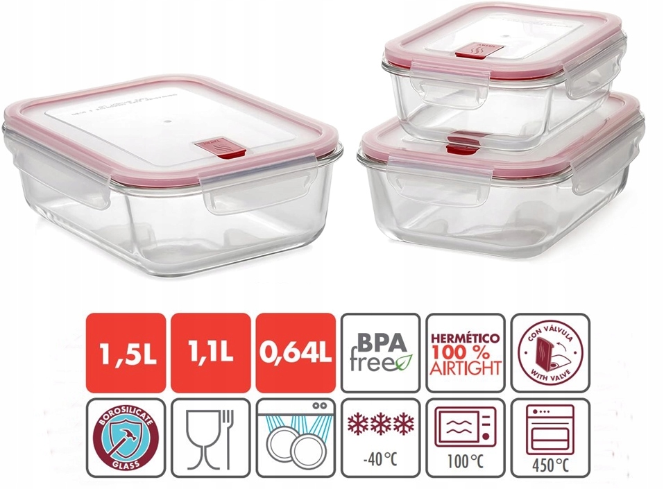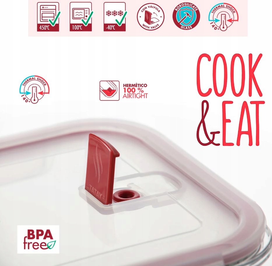 Практичный контейнер для хранения продуктов необходим в каждом доме. Чрезвычайно прочные, стеклянные, герметичные контейнеры с крышкой из линейки Cook & Eat испанской компании Tatay емкостью 640 мл, 1100 мл и 1500 мл прямоугольной формы являются идеальными сосудами для хранения продуктов питания. , например, для обеда, салатов, овощей и фруктов или различных десертов и закусок. Изготовлены из чрезвычайно прочного боросиликатного стекла, которое гораздо более долговечно и устойчиво к высоким температурам и тепловым ударам (резкое изменение температуры, например, от от холодного к горячему) обеспечивает превосходное качество в течение длительного времени. Каждый контейнер оснащен крышкой с вентиляционным отверстием, обеспечивающим выход пара, например, при разогреве в микроволновой печи. Плотная крышка также продлевает свежесть продуктов и предотвращает проникновение запахов, например, в холодильнике. В контейнерах можно успешно хранить горячие и холодные продукты.