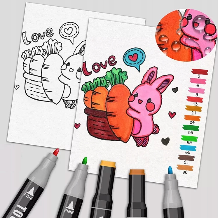 Еще одним преимуществом является то, что он не размачивается на листе бумаги, а значит, вы можно легко наносить один цвет на другой и получать множество других цветов, кроме тех, что входят в набор. Насадки изготовлены из устойчивого к истиранию материала. Они не расслаиваются. Рисунки, выполненные спиртовыми маркерами, после высыхания становятся водонепроницаемыми.